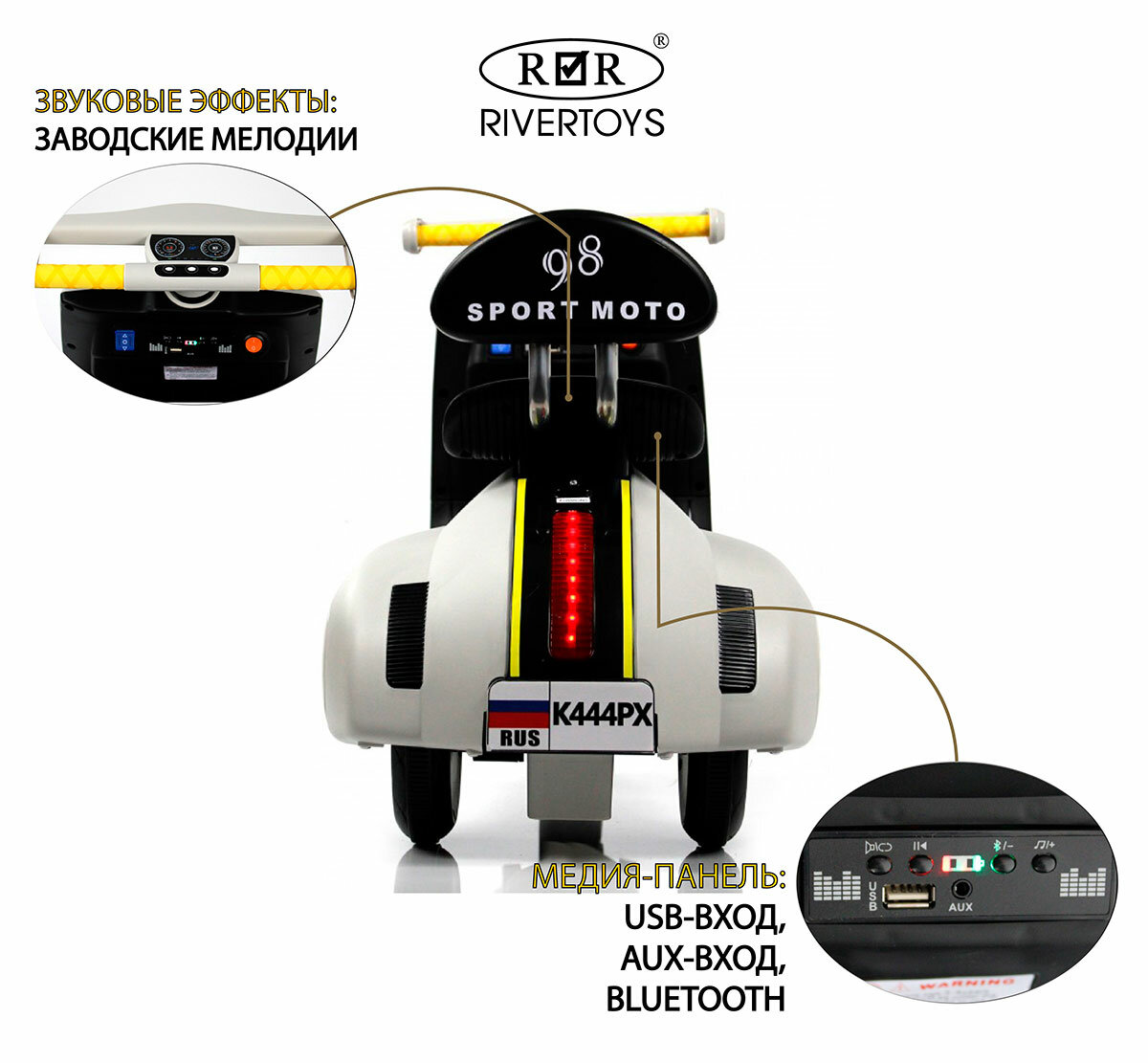 Ниже Вы можете прочитать отзывы на Детский электроскутер RiverToys K444PX Серый, ознакомится с подробными характеристиками, посмотреть интересные обзоры и фотографии на Детский электроскутер RiverToys K444PX Серый.