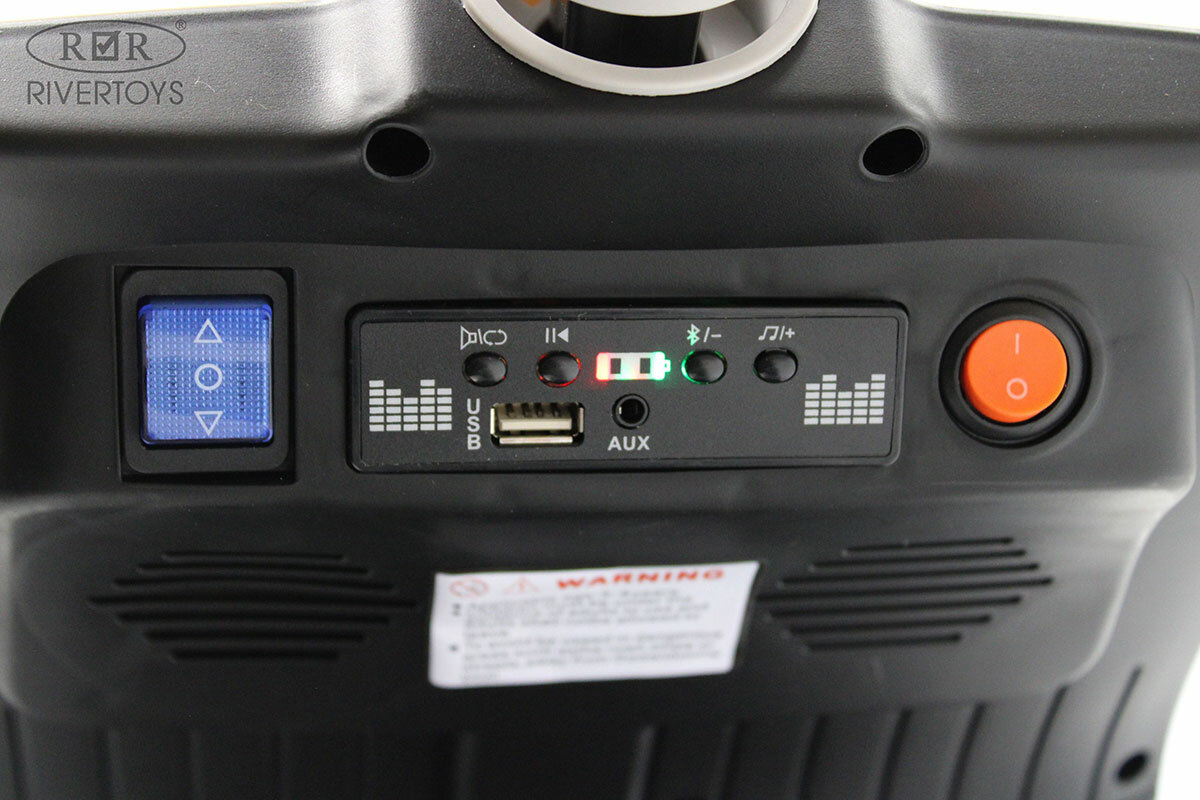 | Дополнительная информация | Световые эффекты: фары передние, задние. Звуковые эффекты: заводские мелодии/звук клаксона. Пульт управления: нет. Амортизаторы: да, задние. Включение: кнопка. Индикатор заряда батареи: да. Колеса: пластик. Скорость: вперед/назад, 3км/ч. Сидение: пластик. Включение: кнопка. Медиа-панель: USB-вход, AUX-вход, Bluetooth. |