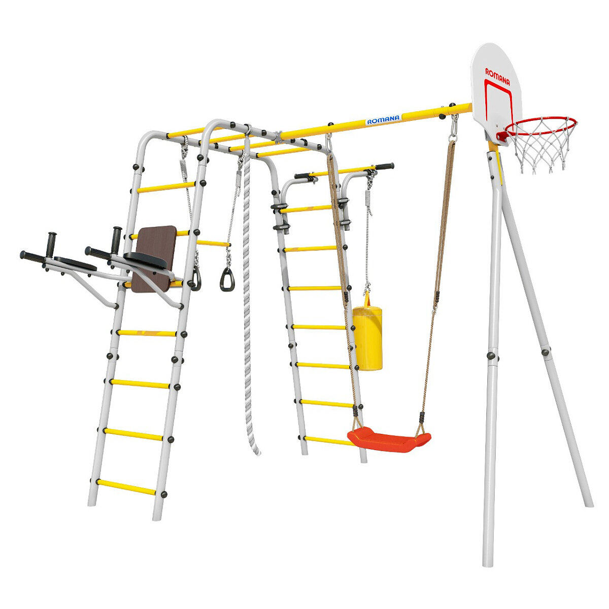 | В комплекте | баскетбольное кольцо, боксерская груша, канат, качели, лестница, рукоход, трапеция с кольцами, турник |