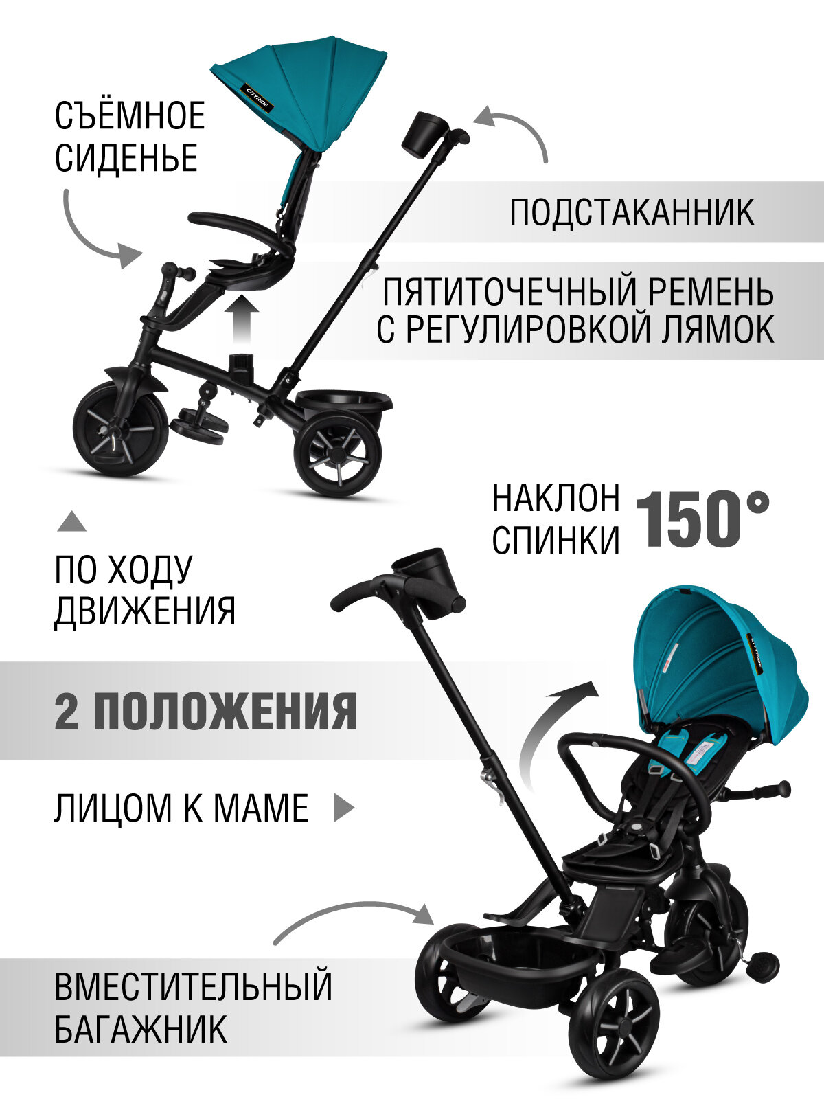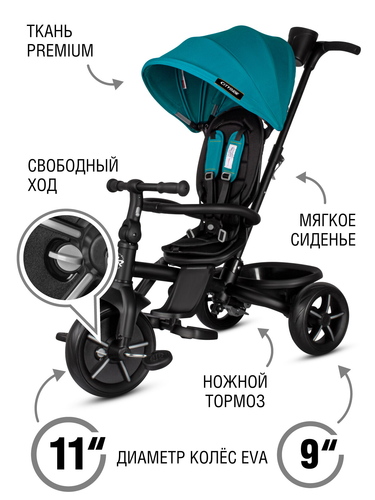 Велосипед детский трехколесный ТМ CITYRIDE XTERRA, складная крыша, колеса EVA 11"/9", поворотное сиденье 360◦, CR-B3-12WT