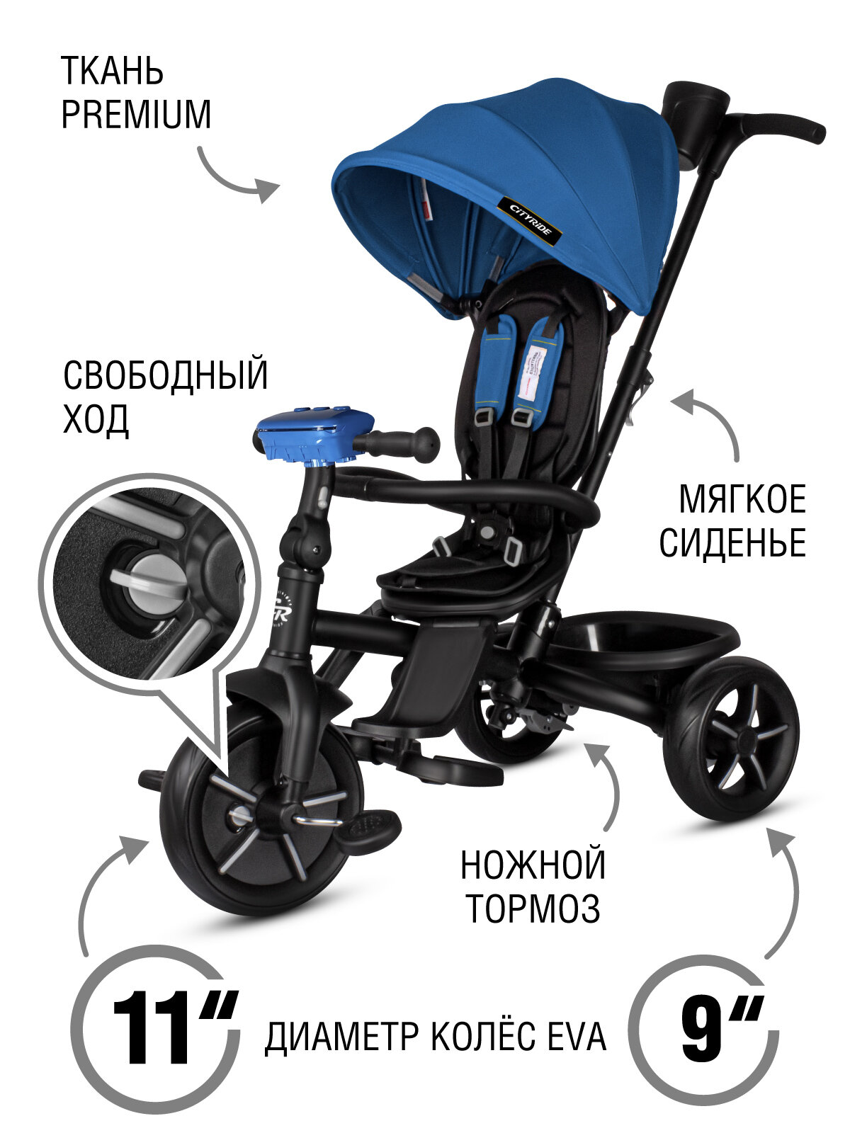 Велосипед детский трехколесный ТМ CITYRIDE XTERRA, складная крыша, колеса EVA 11"/9", поворотное сиденье 360◦, CR-B3-12BL