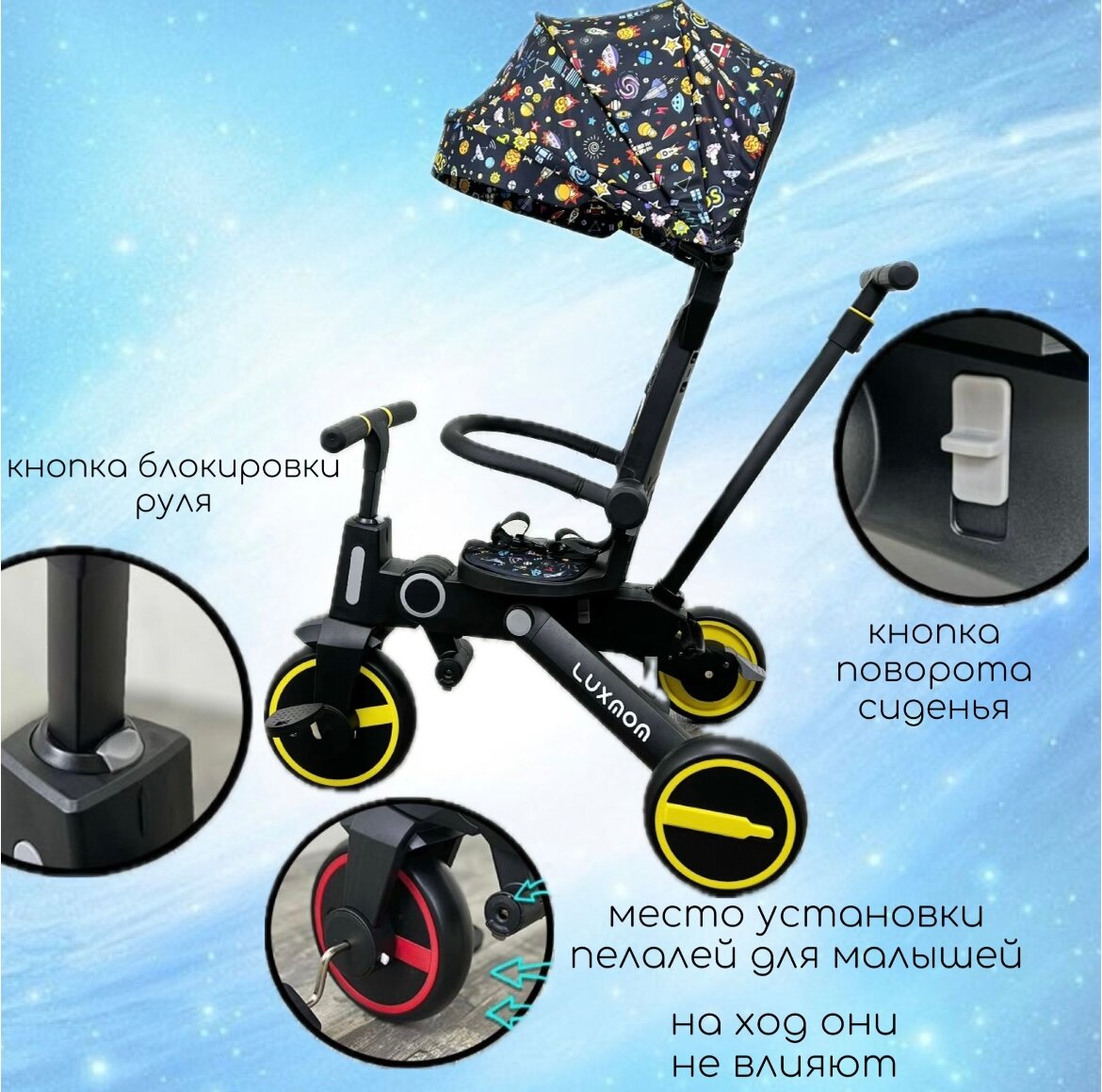 Велосипед складной Трехколесный LUXMOM 368 Черный, поворотное сиденье на 360, родительская ручка