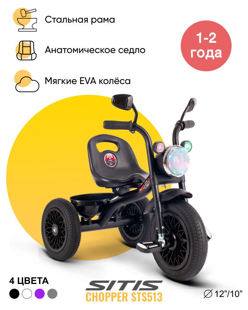 Велосипед детский трехколесный SITIS CHOPPER STS513 (2023) для мальчиков для девочек для детей от 1 до 2 лет стальной с музыкальной панелью, фарой, багажником цвет черный на рост 85-100 см