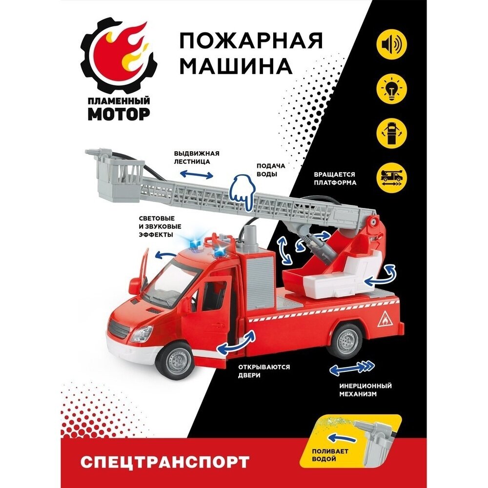 Купить Машина ин. Пожарная машина, откр. двери, стреляет водой, поднимается, выдвигается, вращается лестница, свет, звук, в комплекте тестовые элементы питания AG13/LR44*3шт.
