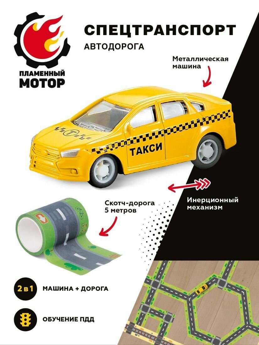 Набор Спецтранспорт Автодорога Пламенный мотор: Машинка инерционная "Такси" и скотч-дорога