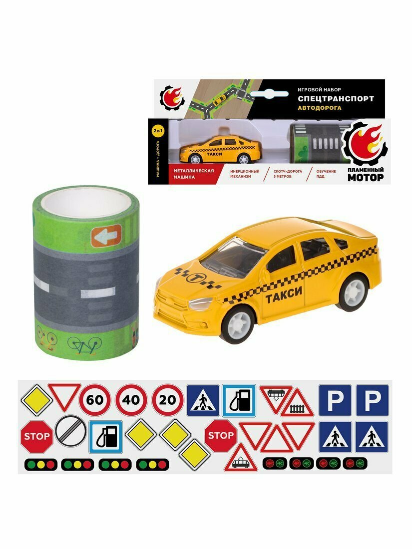 Купить Набор Спецтранспорт Автодорога, машина Такси мет. ин, скотч-дорога 5м, наклеки с дорожными знаками