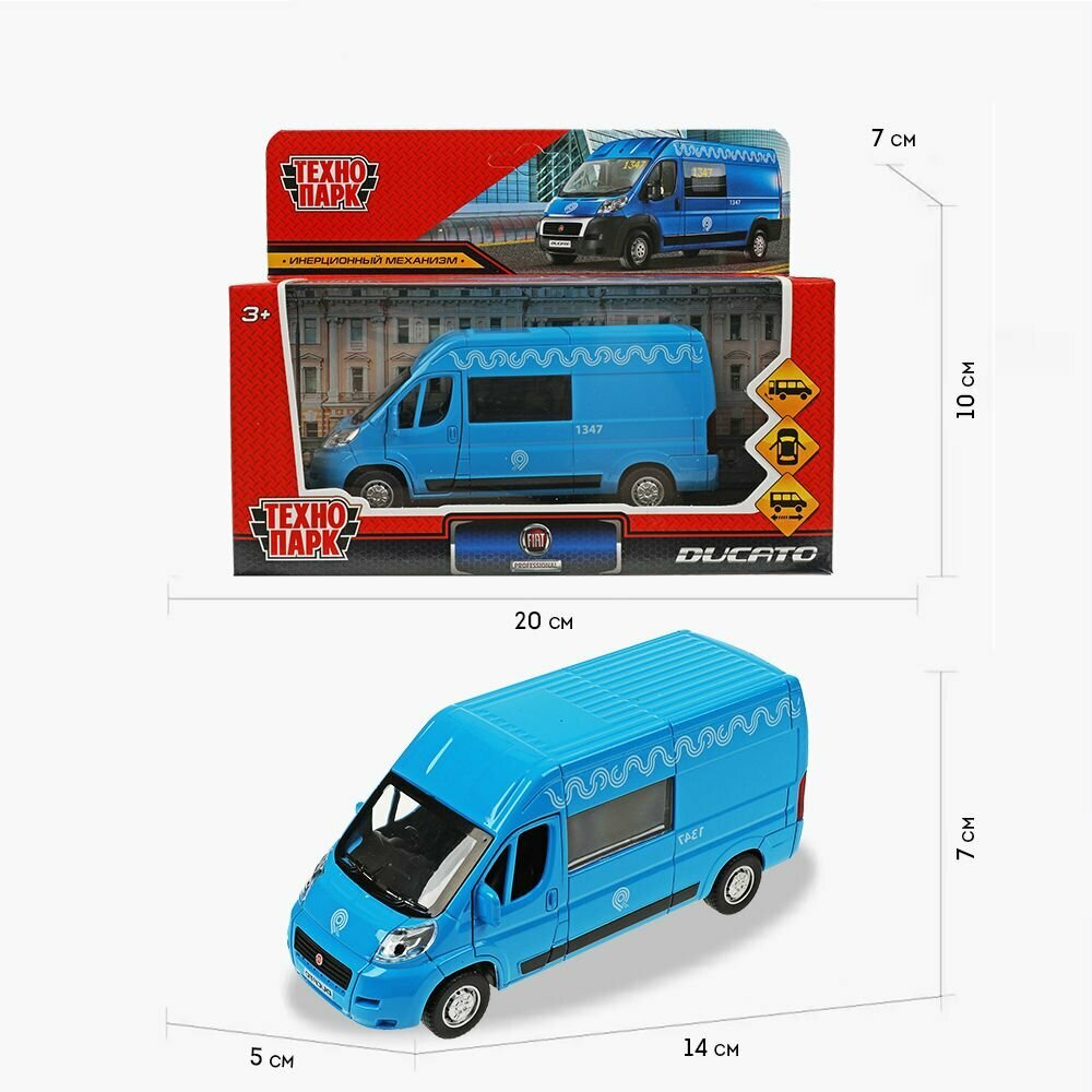 Машинка детская Fiat Ducato 14 см, Технопарк, синяя маршрутка, металлический корпус, открываются двери и багажник