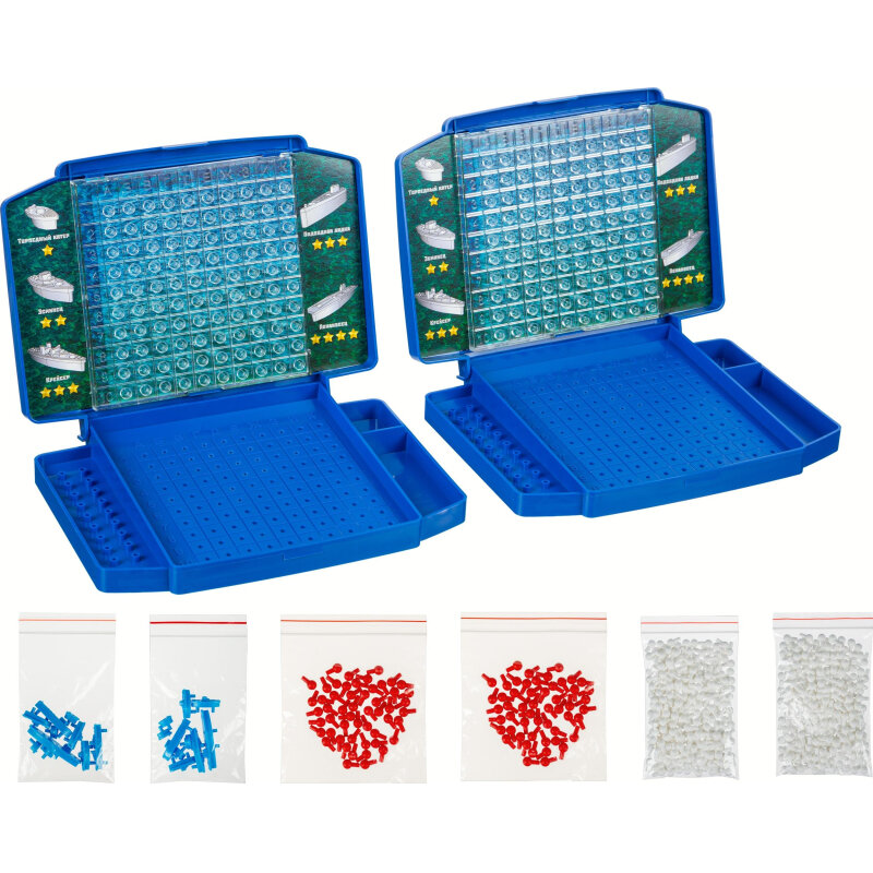 | Комплектация | два игровых пульта, на каждом из которых два поля, миниатюрные корабли, красные и белые фишки |