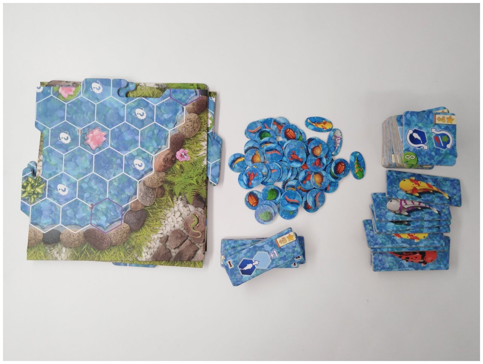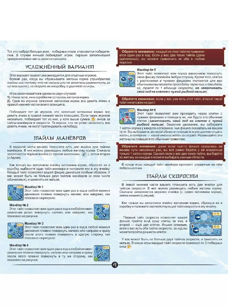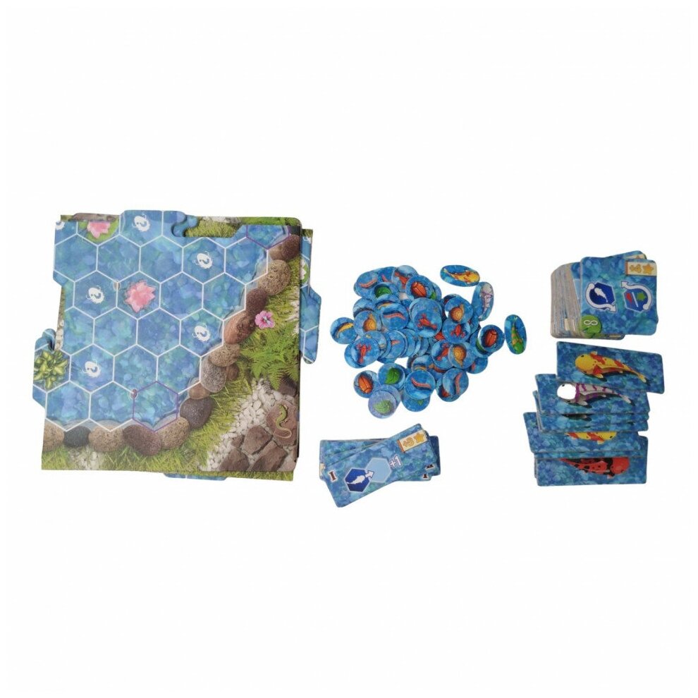 | Комплектация | Сборное поле из 4 частей; Карточки маневров – 35 шт.; Карточки скорости – 12 шт.; Жетоны кормов – 60 шт.; Жетоны карпов – 6 шт.; Планшеты игроков – 6 шт.; Карточки очередности хода – 12 шт.; Правила игры |
