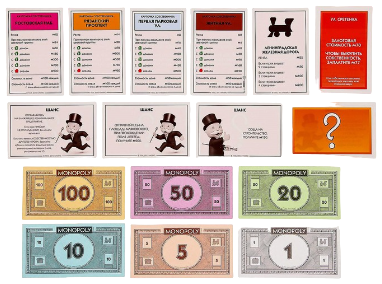 | Комплектация | Состав набора: игровое поле 8 фишек, 28 карточек на право собственности, 16 карточек "Шанс", 16 карточек "Общественная казна", 1 комплект денег Монополии, 32 зеленых дома, 12 красных отелей, 2 кубика, инструкция. |