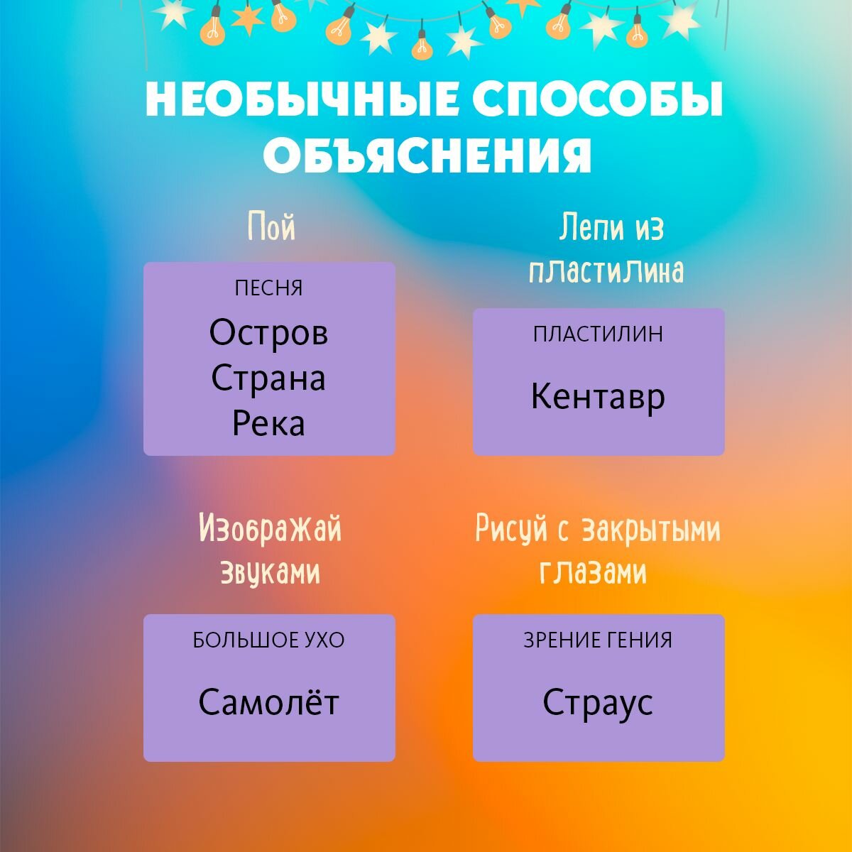| Тип игры | ассоциативная / викторина / для вечеринки / карточная / логическая / развивающая / семейная / со словами / стратегическая |