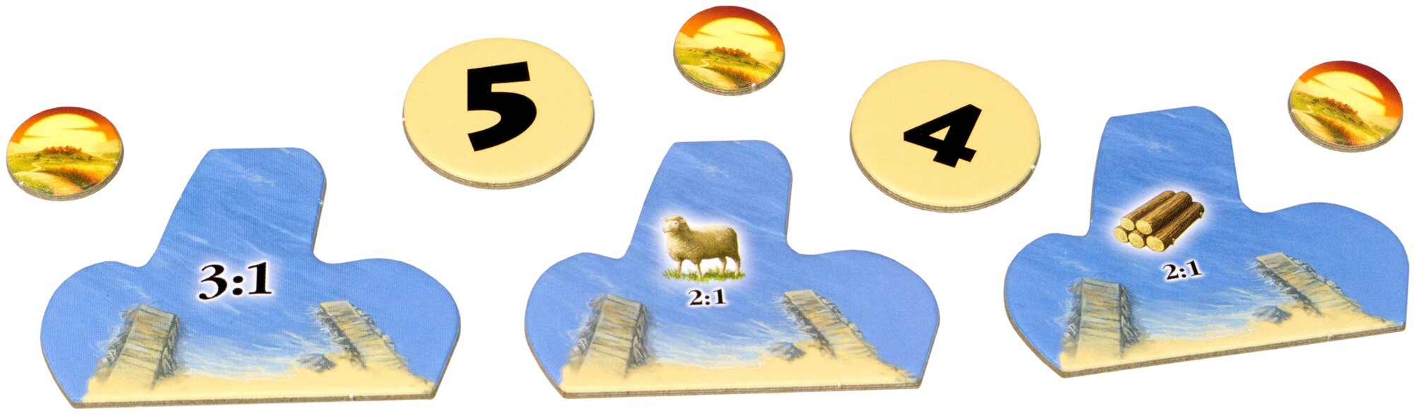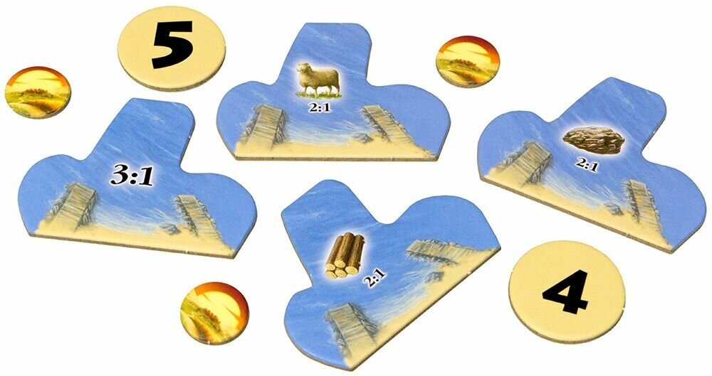 | Комплектация | 30 гексов ландшафта, 6 элементов морской рамки, 61 пластиковая фигурка, 10 номерных жетонов, 10 жетонов гаваней, 57 фишек Катана, 5 карт чудес, правила игры |