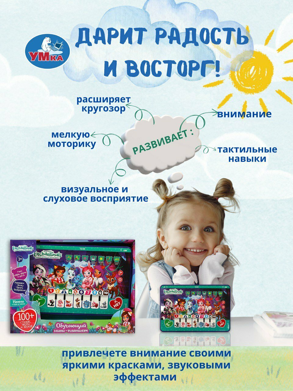Ниже Вы можете прочитать отзывы на Обучающий мини-планшет Enchantimals ТМ УМка для детей от 3 лет, ознакомится с подробными характеристиками, посмотреть интересные обзоры и фотографии на Обучающий мини-планшет Enchantimals ТМ УМка для детей от 3 лет.