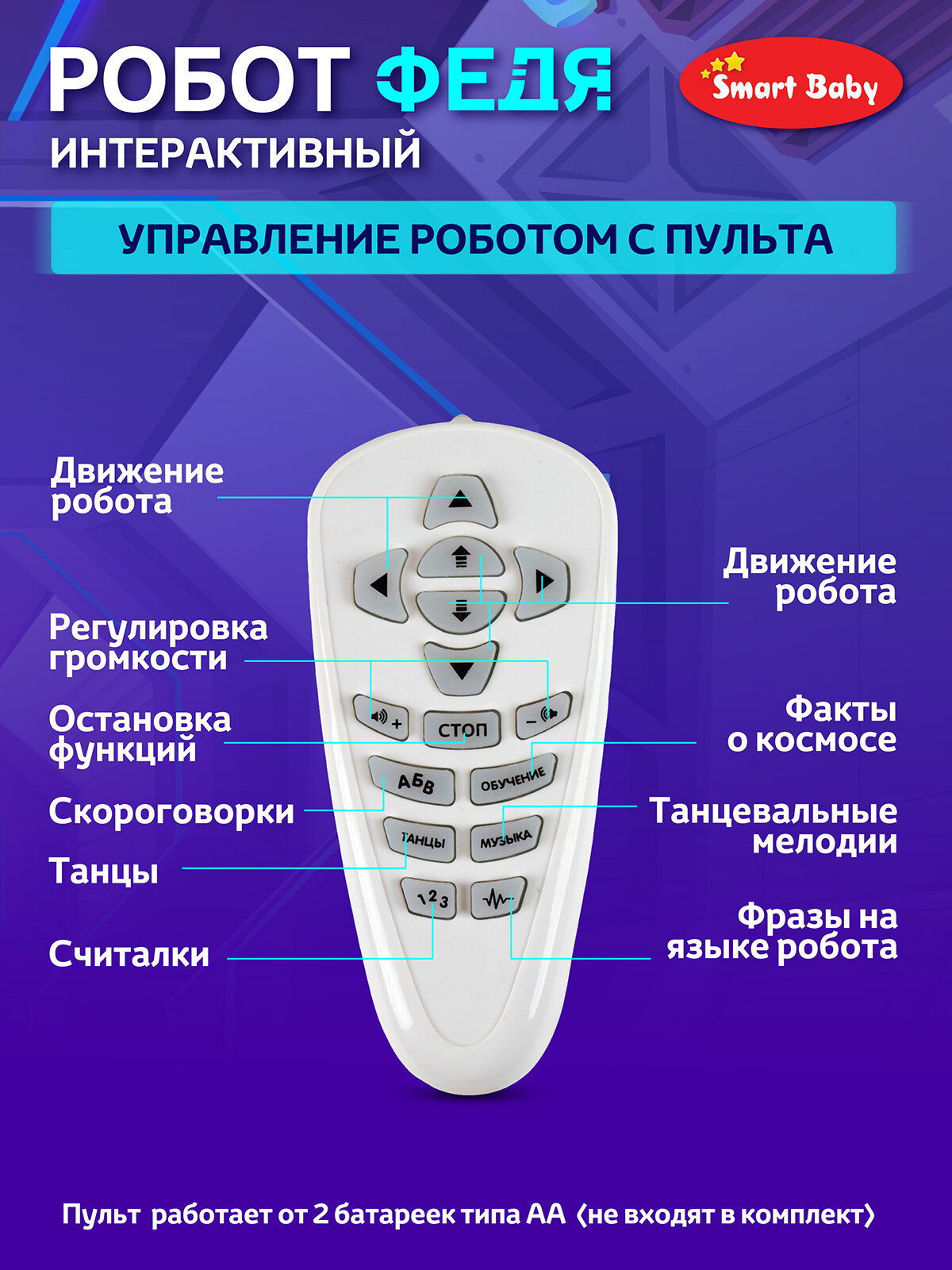 | Дополнительная информация | Интересные факты о космосе, умеет ходить в разные стороны, танцевать под музыку, рассказывать скороговорки, считалочки |