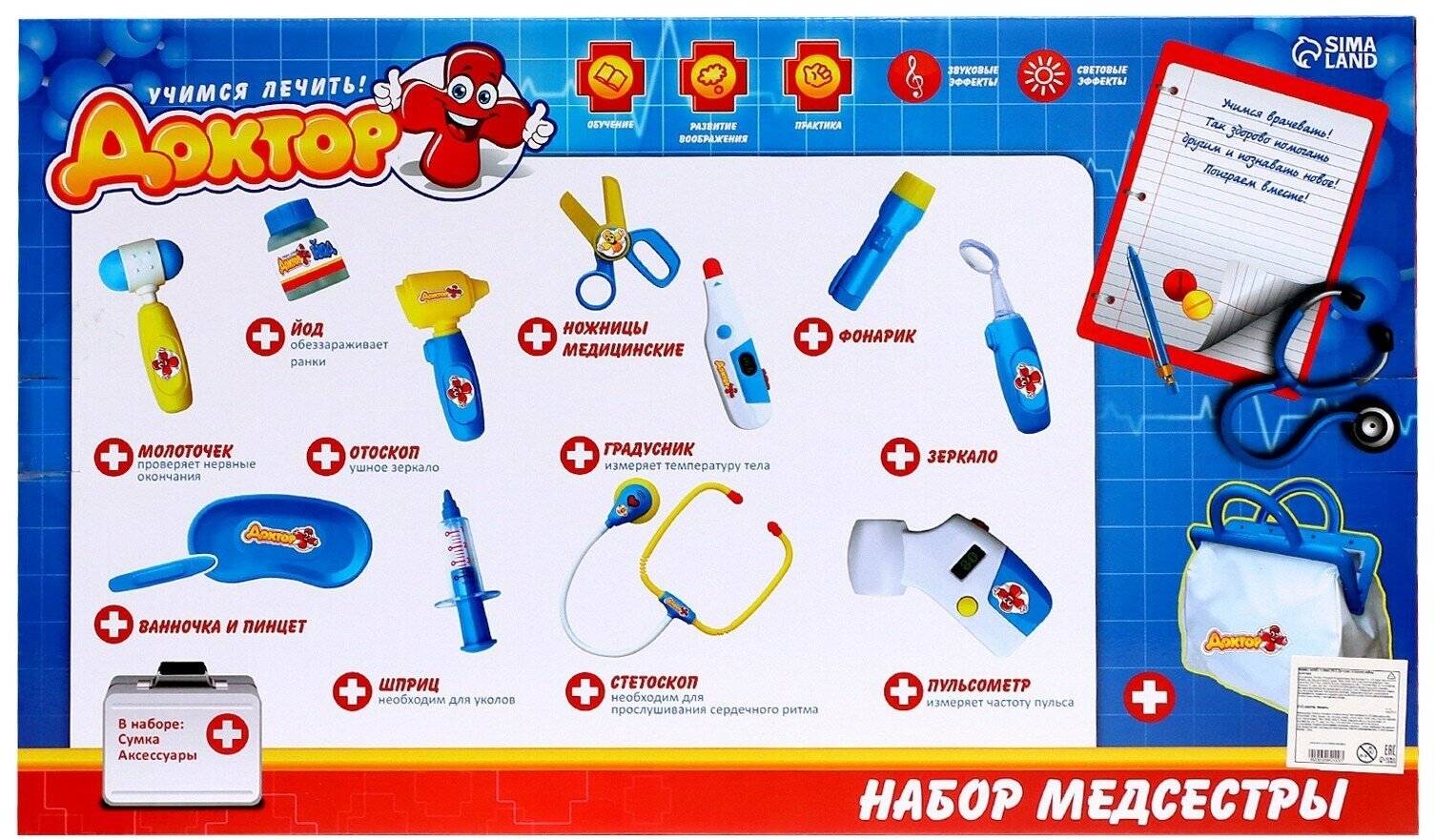 | Комплектация | стетоскоп, термометр, шприц, медицинская сумка, пульсометр, отоскоп, молоточек, зеркало |