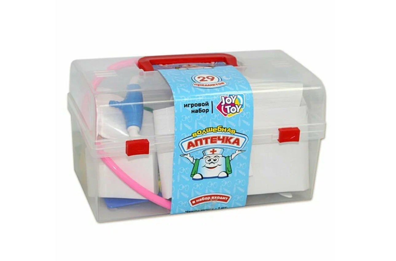 | Комплектация | чемоданчик, муляжи таблеток и микстур, шприц, пинцет, очки, мерный стаканчик, карточка пациента, фонендоскоп, ножницы, ванночка, градусник |