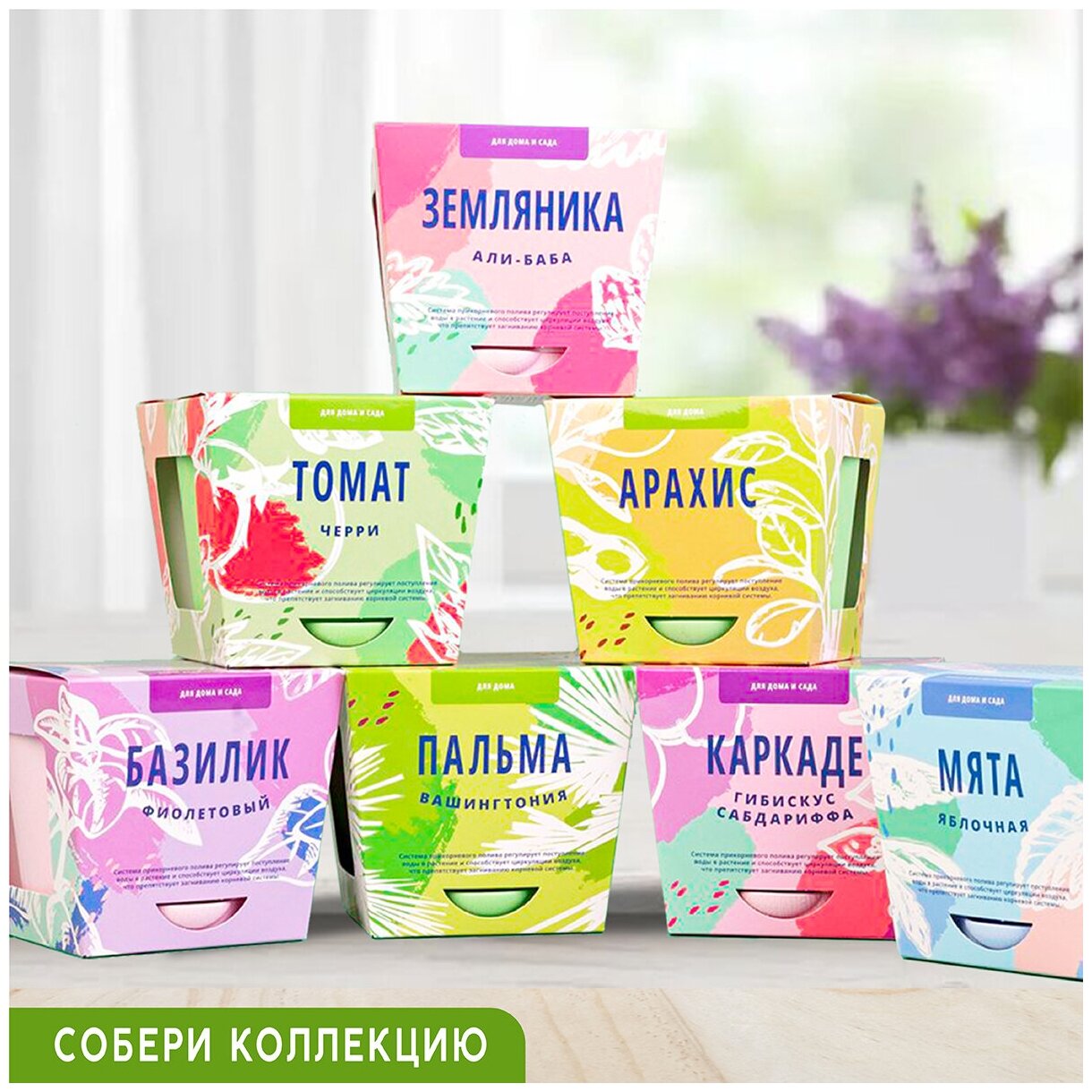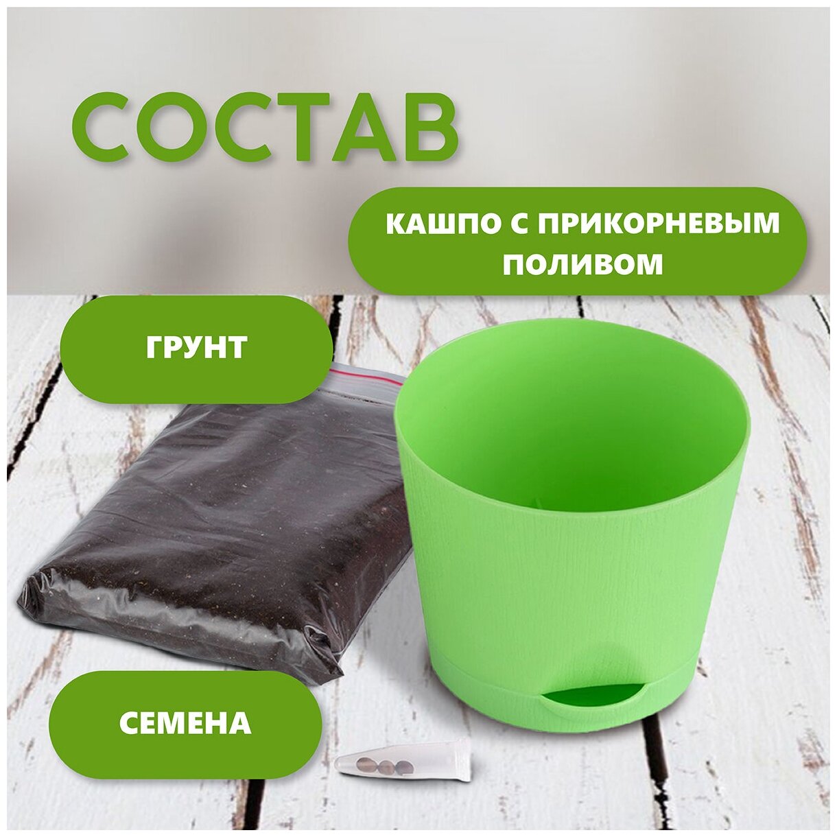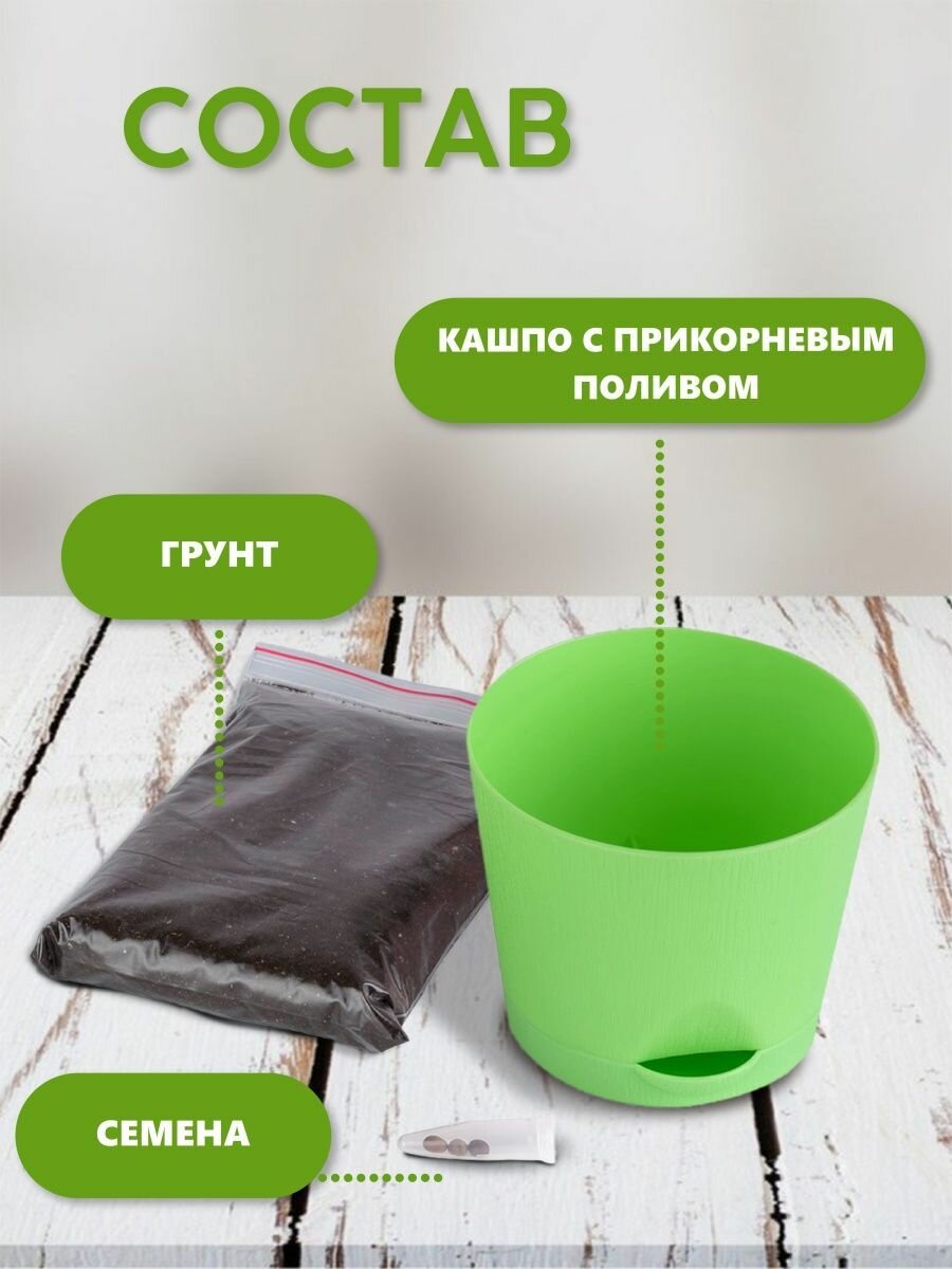 | Комплектация | пластиковый горшок объемом 0,4 литра с системой прикорневого полива, семена, плодородный грунт |