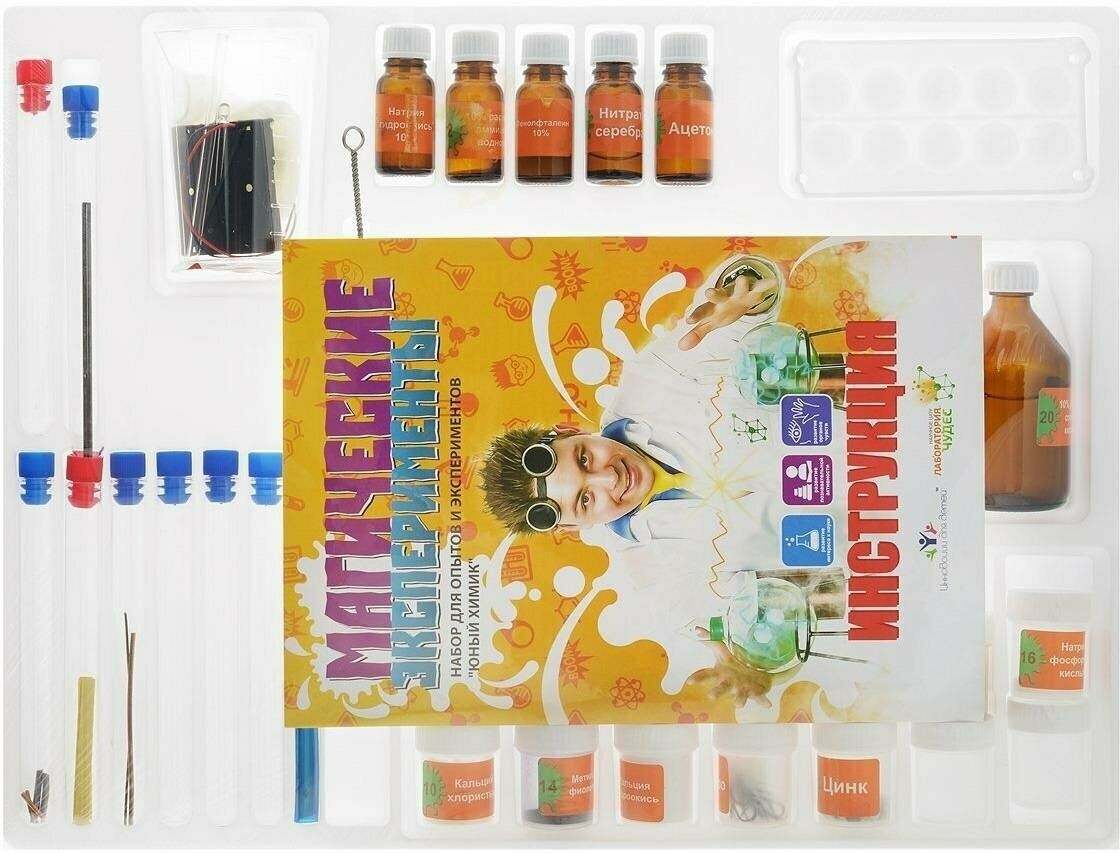 | Комплектация | Инструкция, чашка Петри, фильтровальная бумага, сухое горючее, подставка под пробирки (штатив), шпатель, светодиод, батарейный отсек, перчатки, ершик для пробирок, чашка для выпаривания, пробирки химические, пипетка Пастера, прямая стеклянная трубка, мерный стакан, Г-образная стеклянная трубка, щавелевая кислота, цинк, сульфат никеля, железо хлорное, 10% раствор фенолфталеина, медь сернокислая, индикаторная бумага лакмусовая нейтральная, аденозин нитрат, графитовые стержни, пробиркодержатель, ацетон, 10% раствор гидроксида натрия, 10% раствор аммиака водного, медь, алюминий, фосфат натрия, метиловый фиолетовый, 10% раствор соляной кислоты, кальций хлористый, железо, нихром, компакт-диск с видео. |