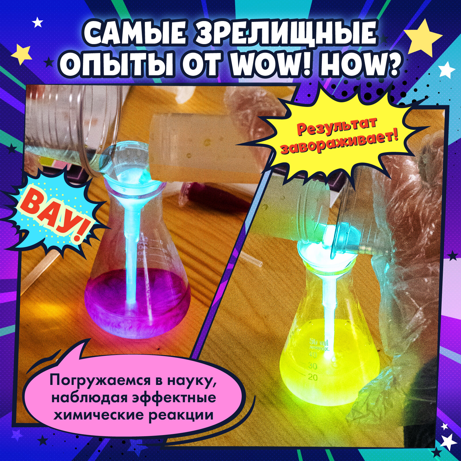 Набор для опытов из 3 химических экспериментов для детей WOW! HOW? Сет №2. Подарок для девочки, мальчика от 6 лет и 8 лет. Юный химик