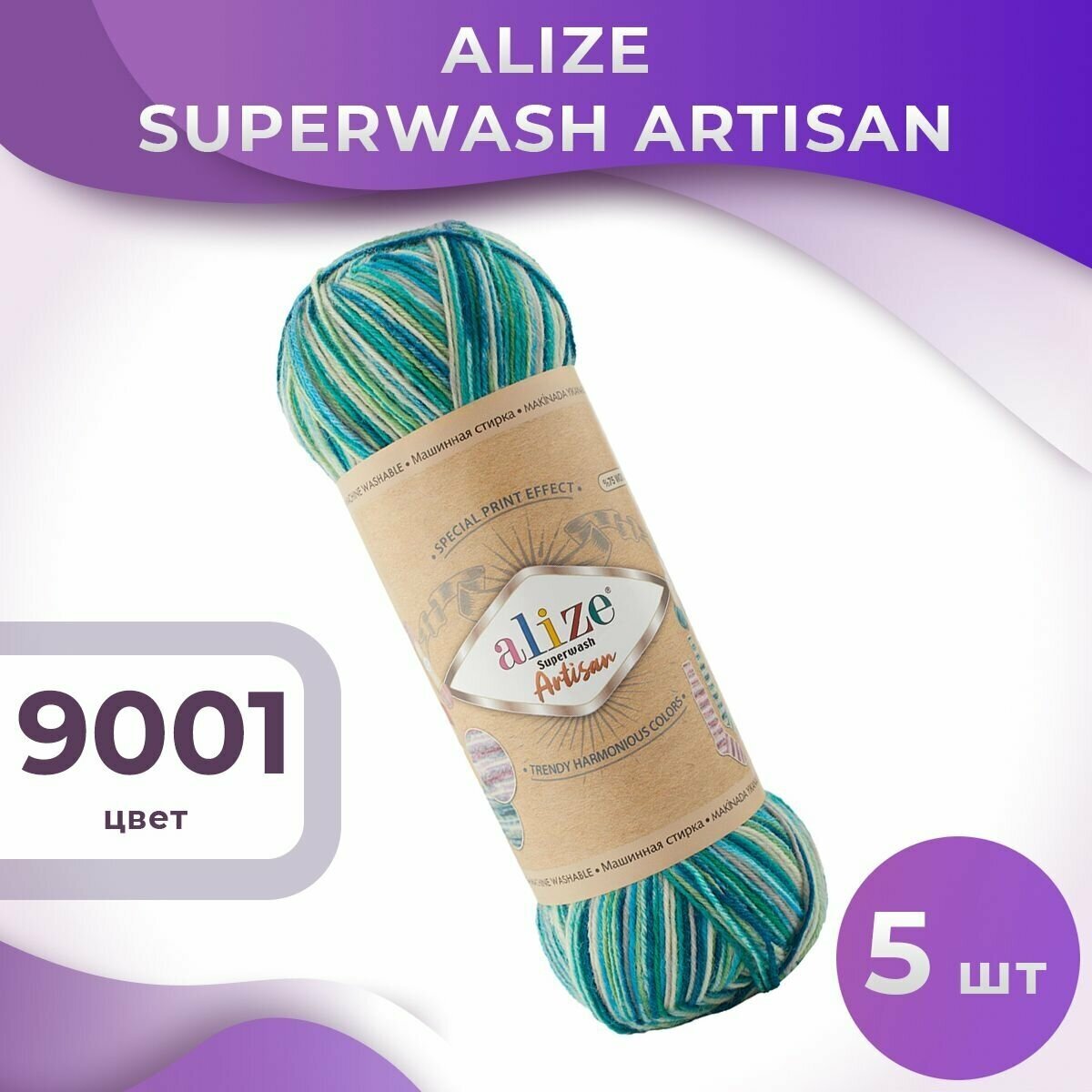 СохранитьПряжа SUPERWASH ARTISAN ALIZE, зел. бирюза принт - 9001, 75% SW шерсть, 25% полиамид, 5 мотков, 100 г, 420 м. интересное: