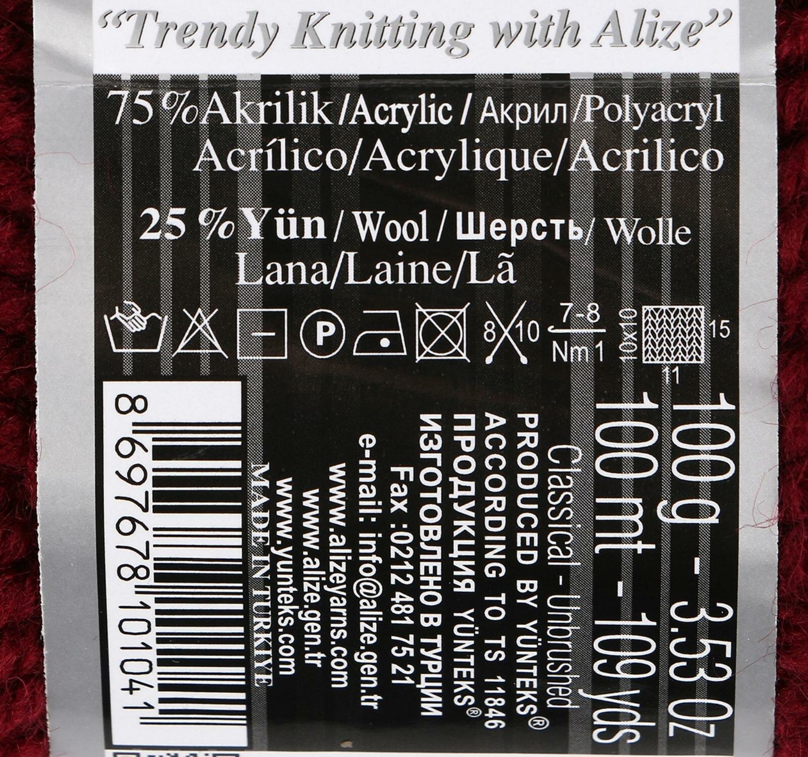 СохранитьПряжа Alize Superlana Maxi (Ализе Суперлана Макси) - 1 моток 57 бордовый 75% акрил, 25% шерсть 100м/100г интересное: