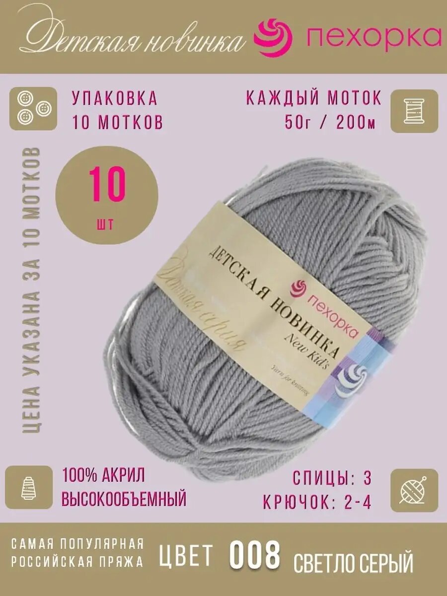 Пряжа Пехорка Детская новинка 10 мотков, цвет светло-серый 08, состав 100% акрил, вес 50г, длина 200м
