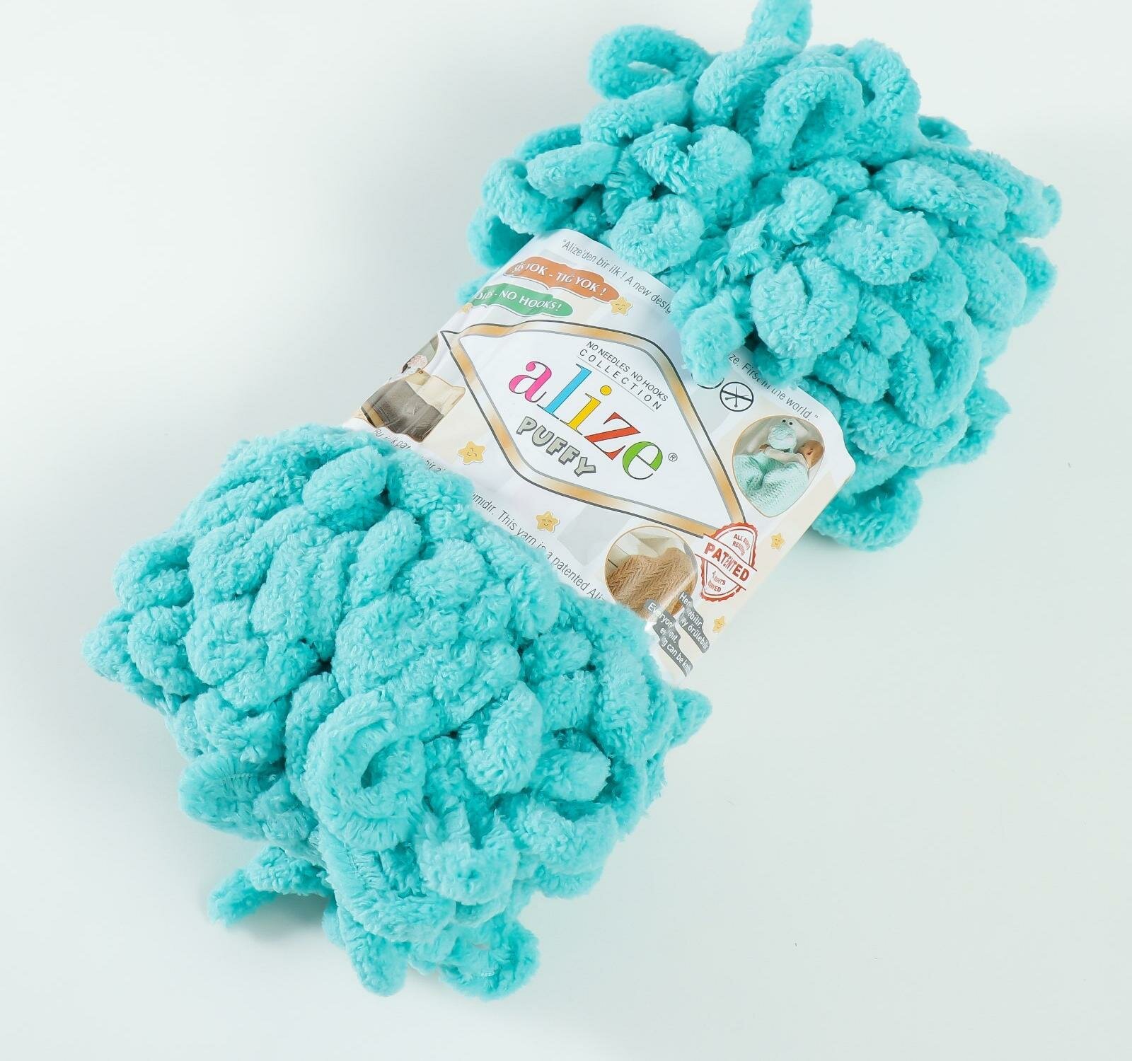 Пряжа плюшевая Alize Puffy (Ализе Пуффи) - 5 мотков 19 светло-бирюзовый для вязания руками, гипоаллергенная, большие петли (4см), 9м/100г