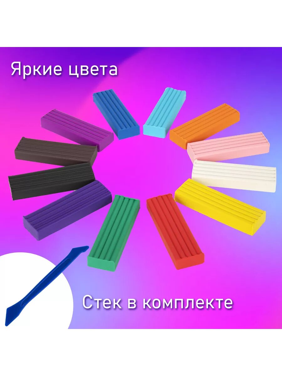 | Комплектация | в составе набора 12 брусков по 20 г разных цветов: белый / черный / коричневый / желтый / оранжевый / красный / розовый / фиолетовый / сиреневый / голубой / синий / зеленый. Масса набора – 240 г. Со стеком. |