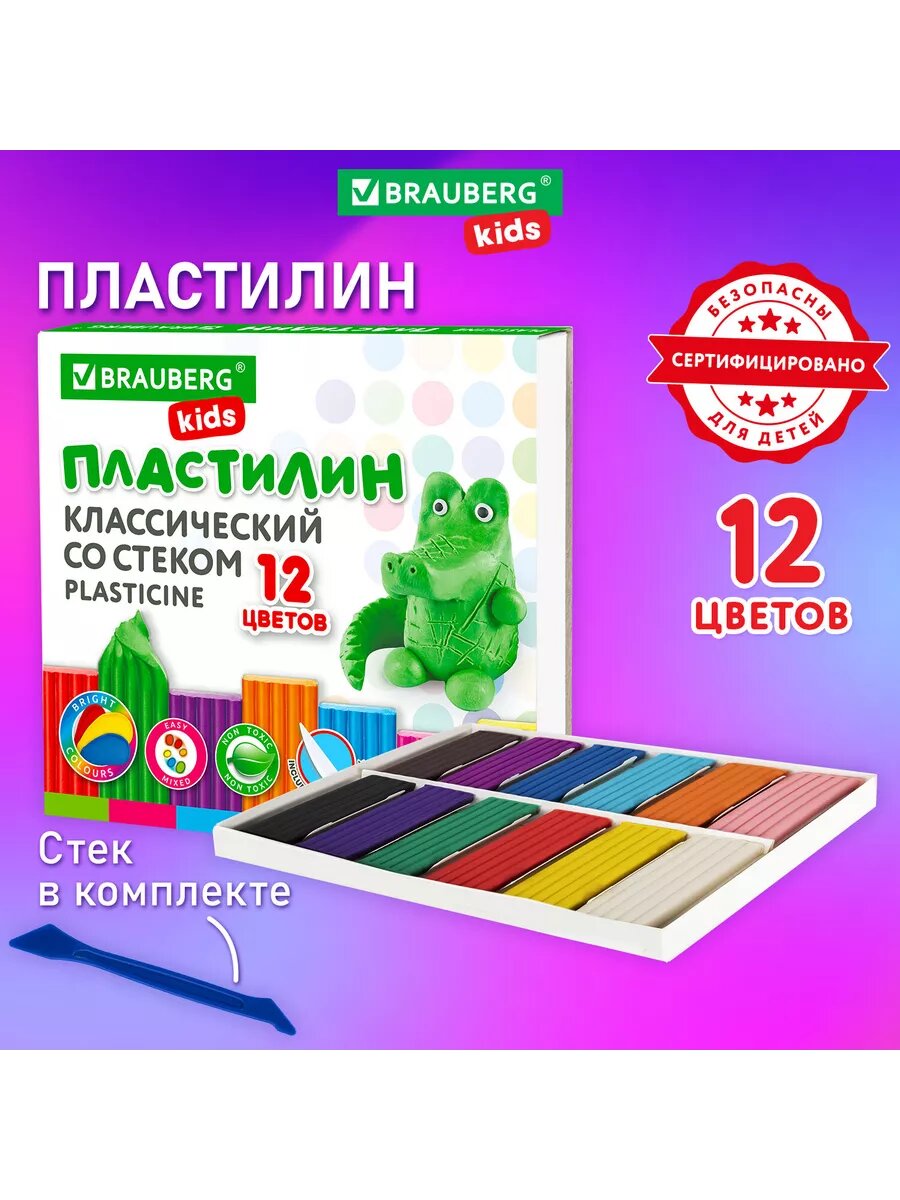 Купить Пластилин Brauberg Kids, классический, со стеком, 12 цветов, доска для лепки формата А4