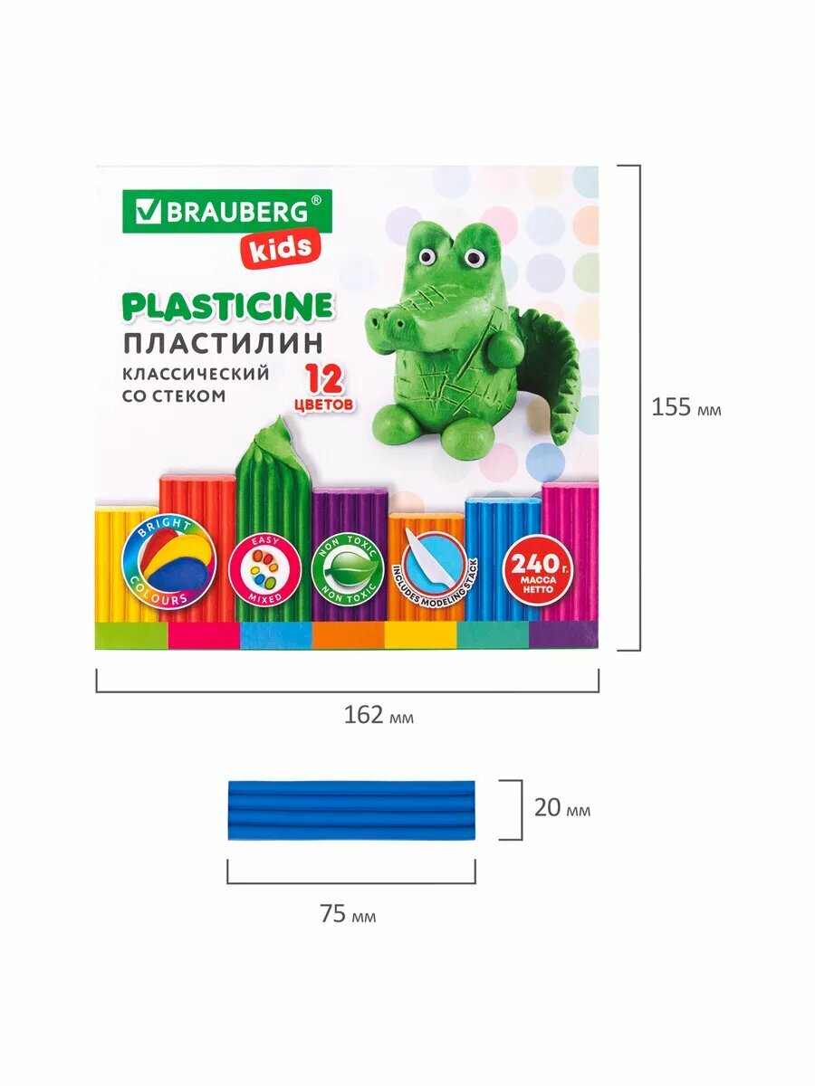 Пластилин классический BRAUBERG KIDS, 12 цветов, 240 г, стек, высшее качество, 106436