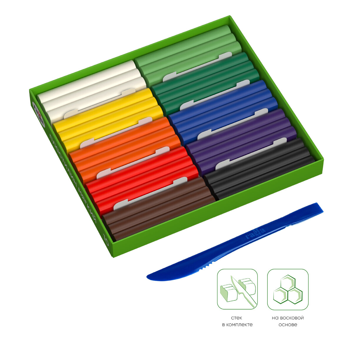 Комплект 10 шт, Пластилин восковой мягкий Гамма "Пчелка", 08 цветов, 120г, со стеком, картон. упаковка