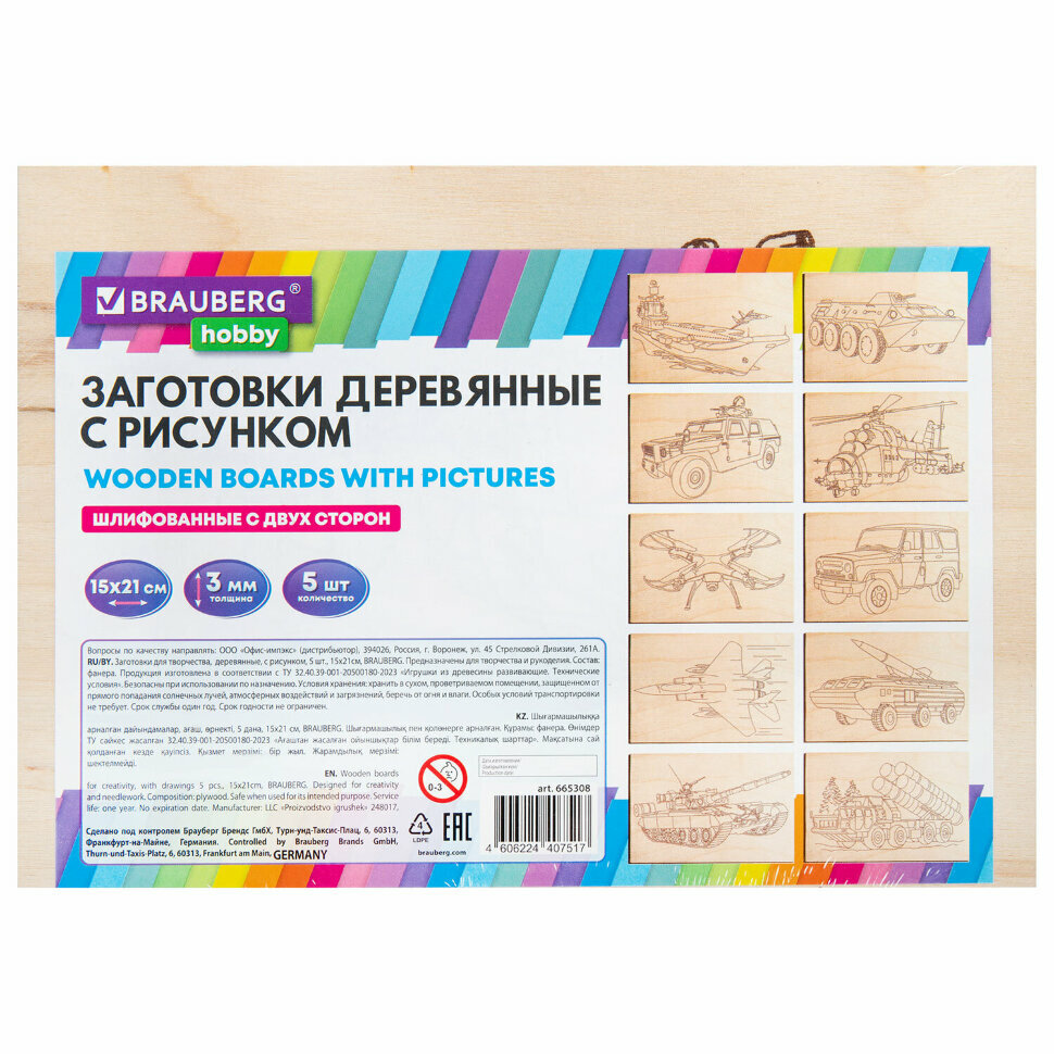 Купить Заготовки деревянные для выжигания "Военная техника", 5 шт, 10 рисунков, 15х21 см, BRAUBERG HOBBY, 665308, 665308