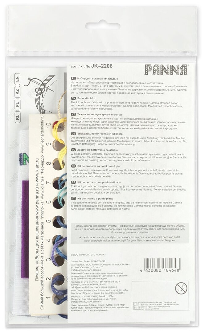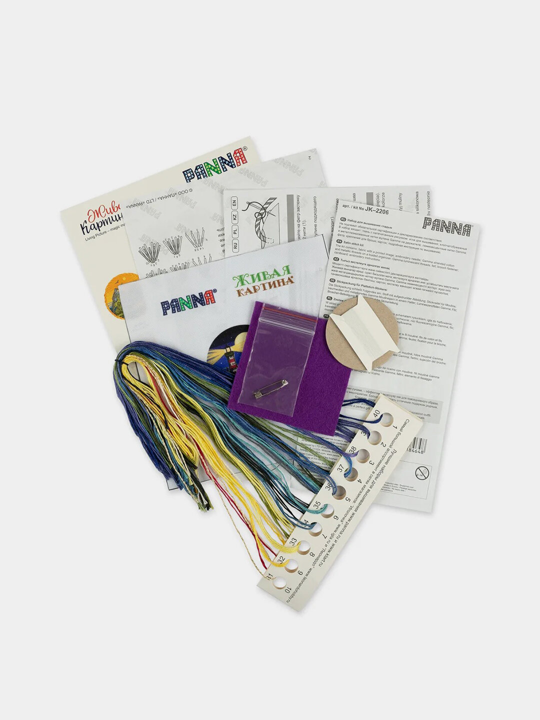 | Комплектация | ткань с нанесенным рисунком, игла, нитки мулине, фетр, крепление для броши, картон, подробная инструкция по вышиванию. |