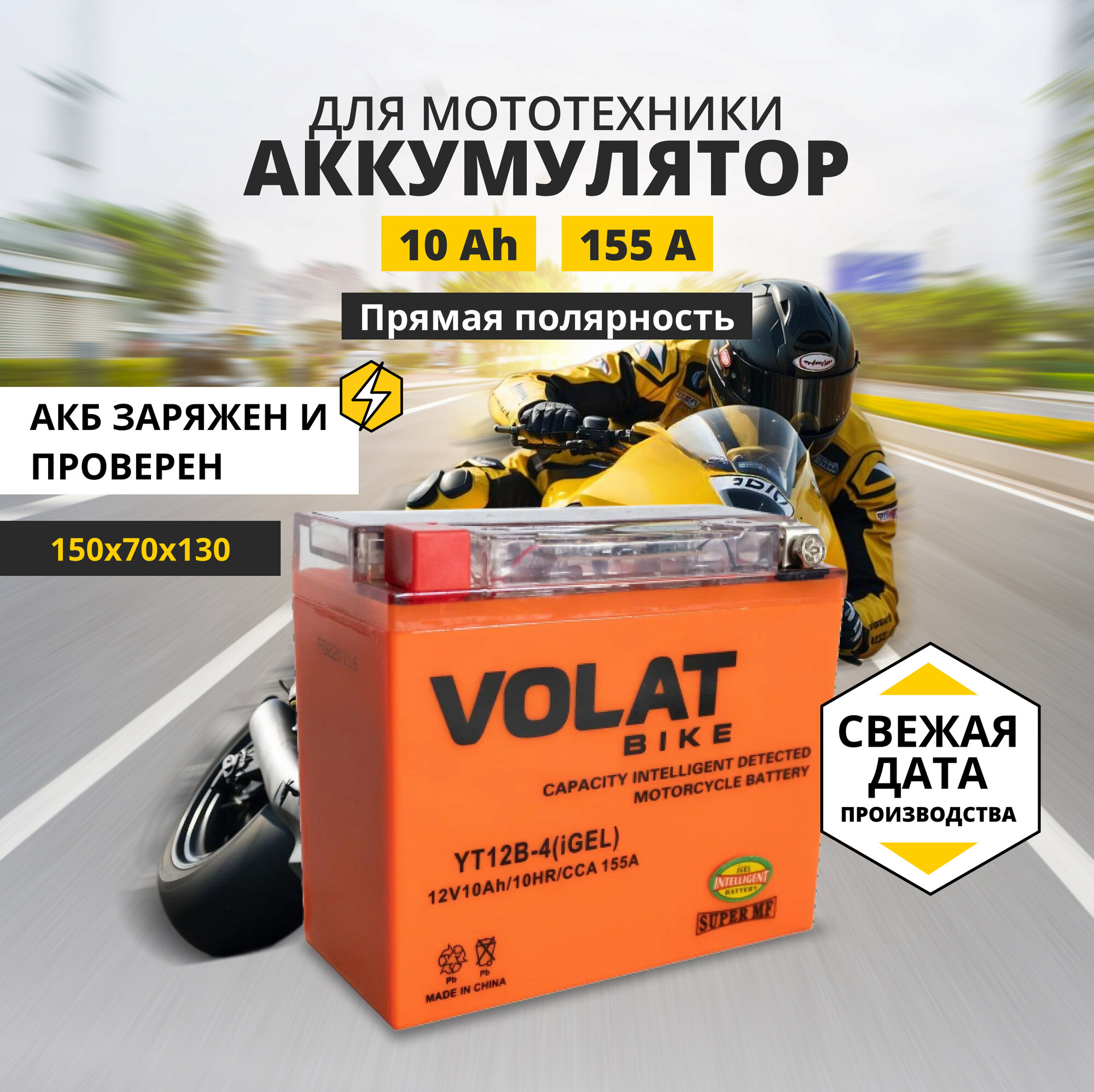 Аккумулятор для мотоцикла 12v Volat YT12B-4(iGEL) прямая полярность 10 Ah 155 A гелевый, акб на скутер, мопед, квадроцикл, мотоцикл интересное: