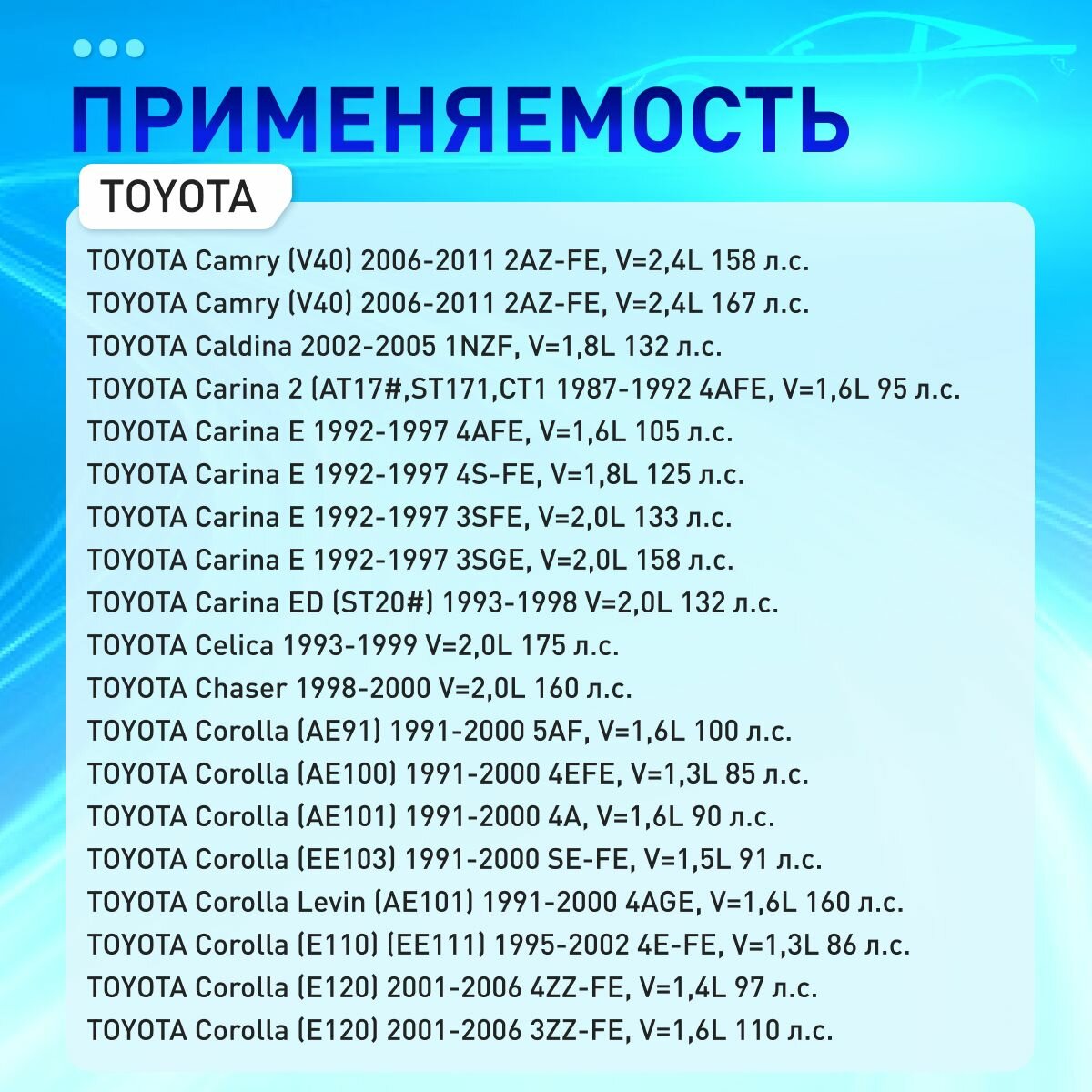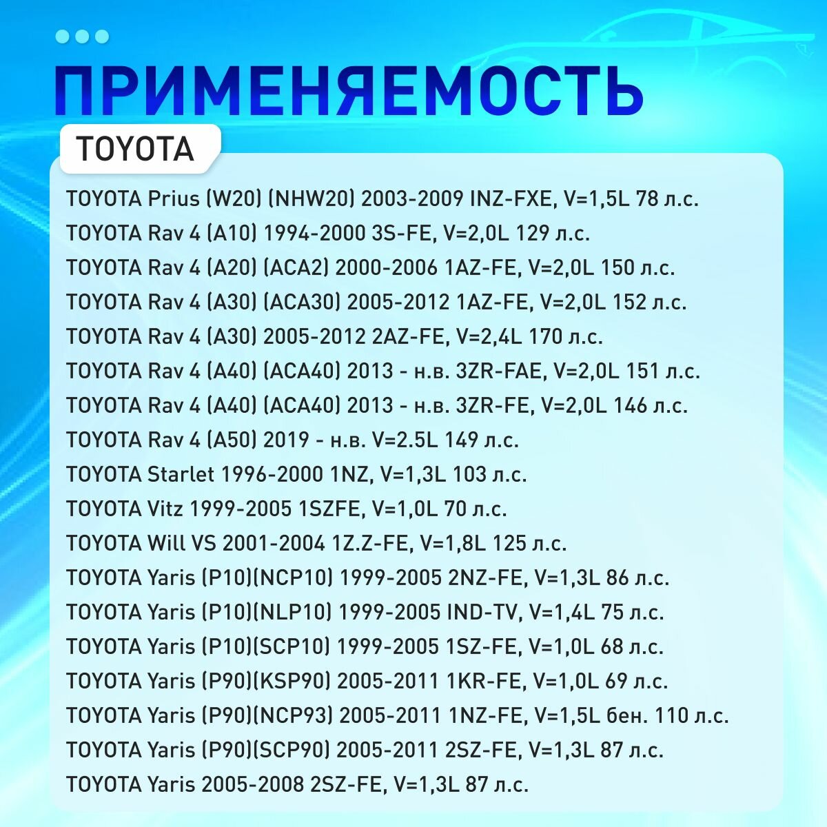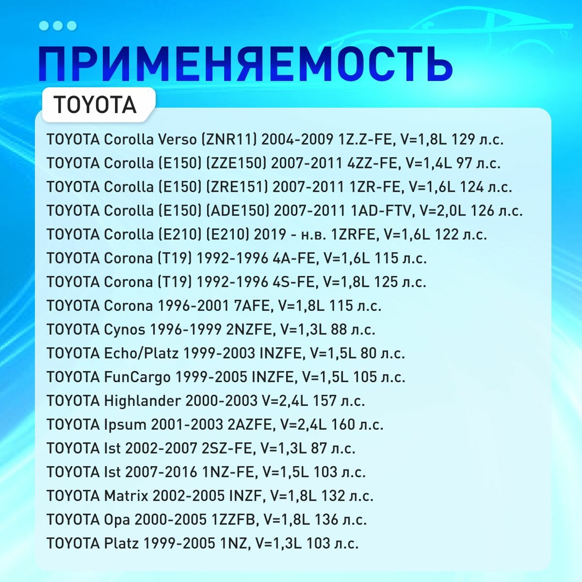 | Модель автомобиля | Citroen C1 / FAW Vita / Geely Emgrand EC7 / Lifan Breez / Lifan Smily / Lifan Solano / Lifan X60 / Peugeot 107 / Peugeot 108 / Toyota Auris / Toyota Avensis / Toyota Aygo / Toyota Camry / Toyota Carina / Toyota Celica / Toyota Corolla / Toyota Corolla Verso / Toyota Corona / Toyota Lite Ace / Toyota LiteAce / Toyota MR2 / Toyota Paseo / Toyota Picnic / Toyota Prius / Toyota RAV4 / Toyota Starlet / Toyota Tercel / Toyota Town Ace / Toyota Yaris / Toyota Yaris Verso / Toyota iQ |