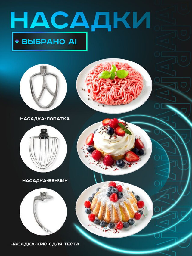 | Насадки | венчик для взбивания / крючки для замешивания теста / лопатка |