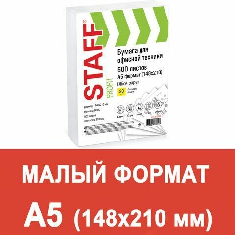 Бумага офисная STAFF "Profit", малого формата А5 (148х210 мм), 80 г/м2, 500 л., марка С, белизна 149%, 110446