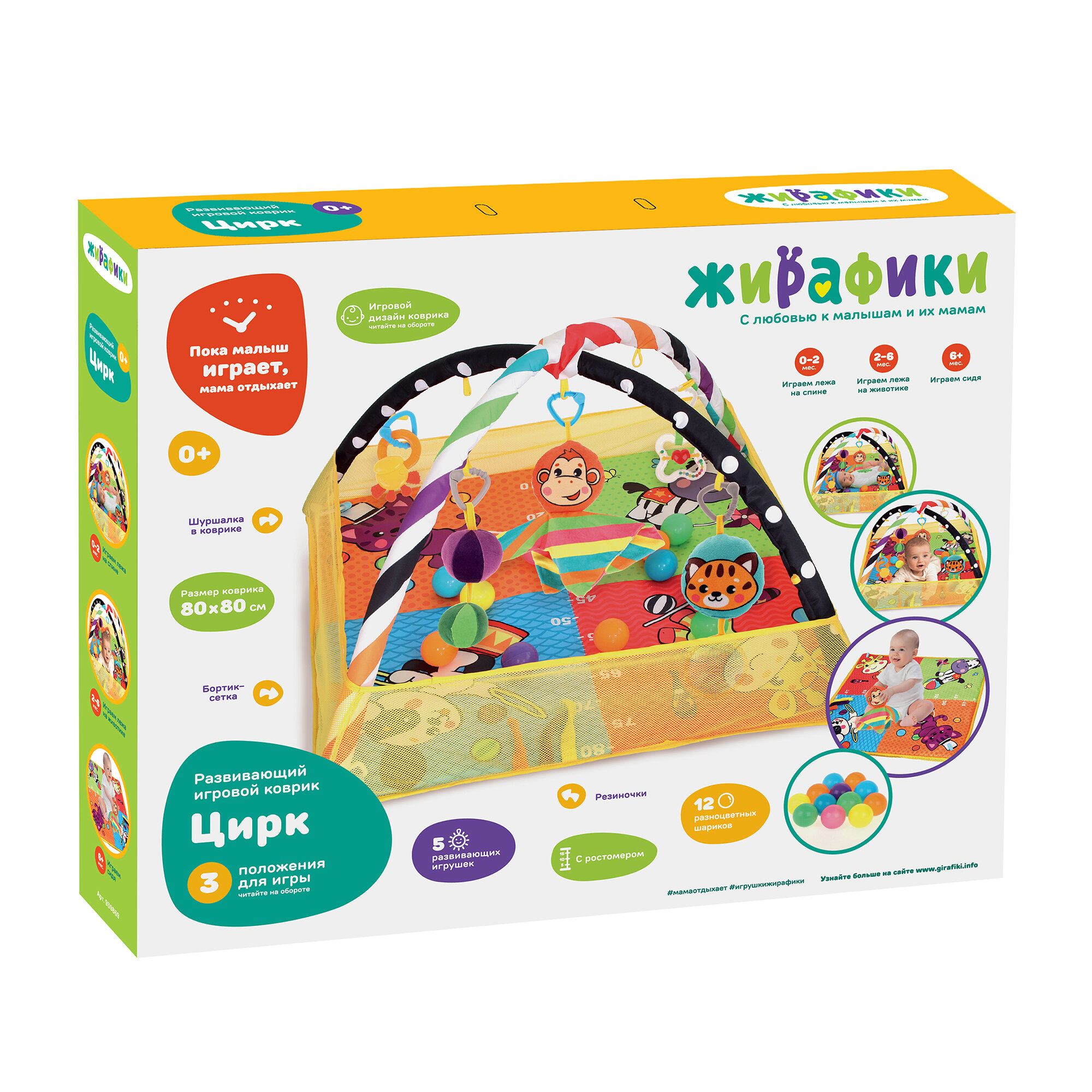 Развивающий Игровой Коврик Для Малышей Жирафики. Цирк (80*80см, 2 дуги, 5 игрушек, ростомер, шарики,