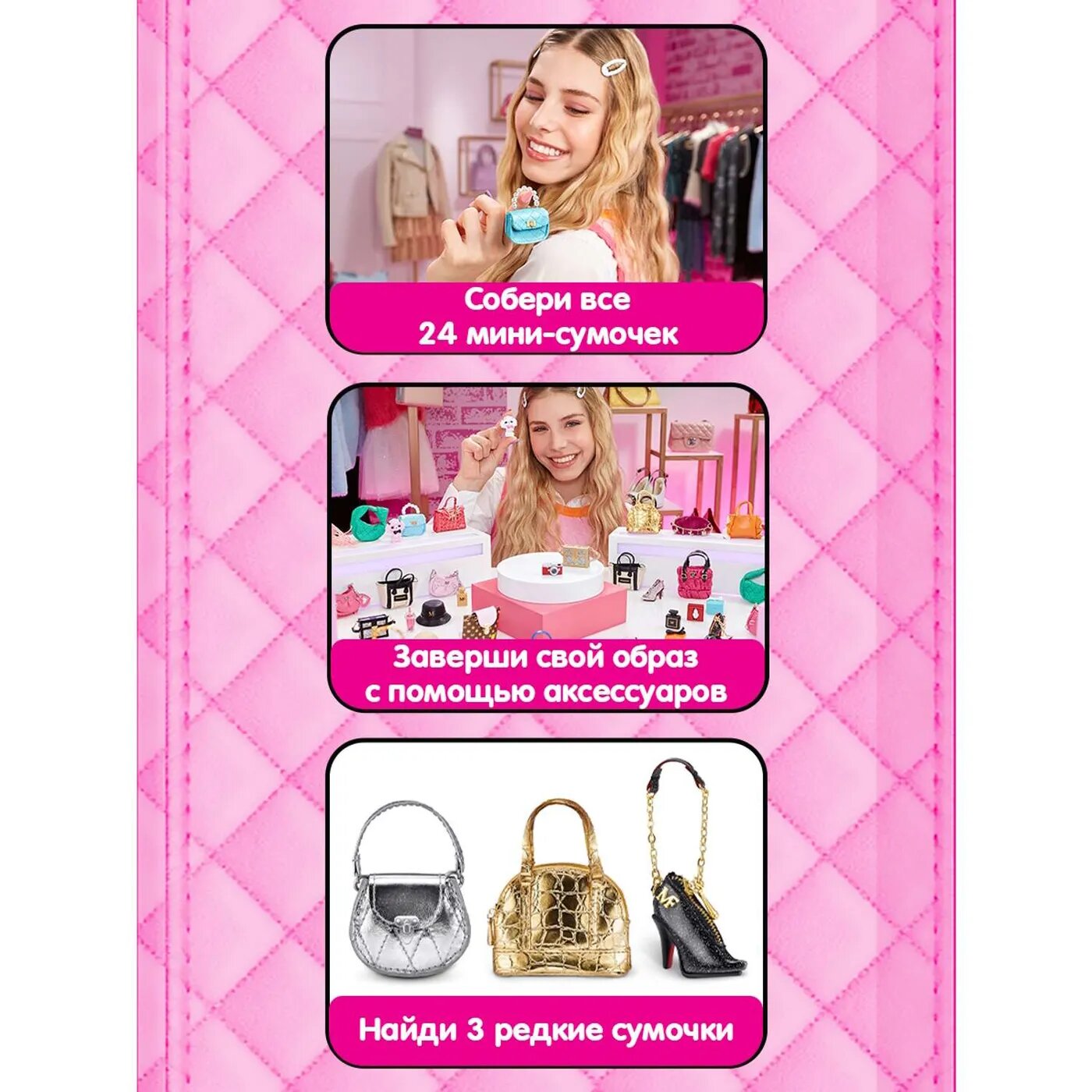 | Комплектация | 1 капсула с сюрпризом, 1 мини-сумочка, 4 аксессуара |