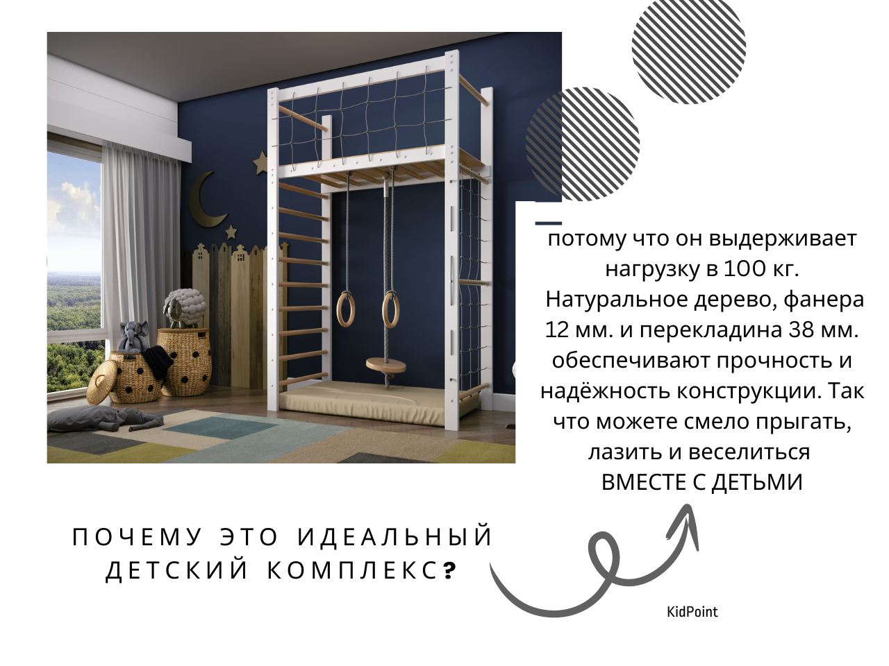Детский спортивный комплекс KidPoint J1 "Джунгли", крепление к стене, до 100 кг. Массив сосны. Комплект 7 в 1 интересное: