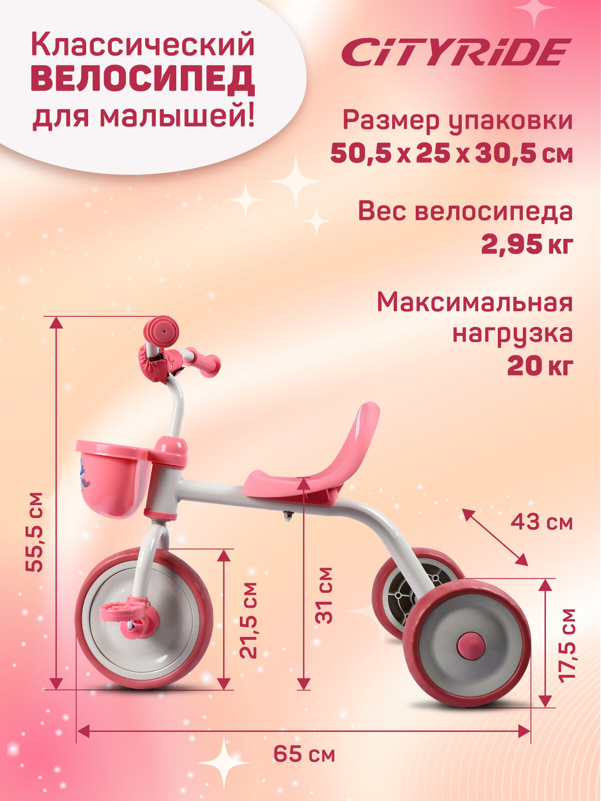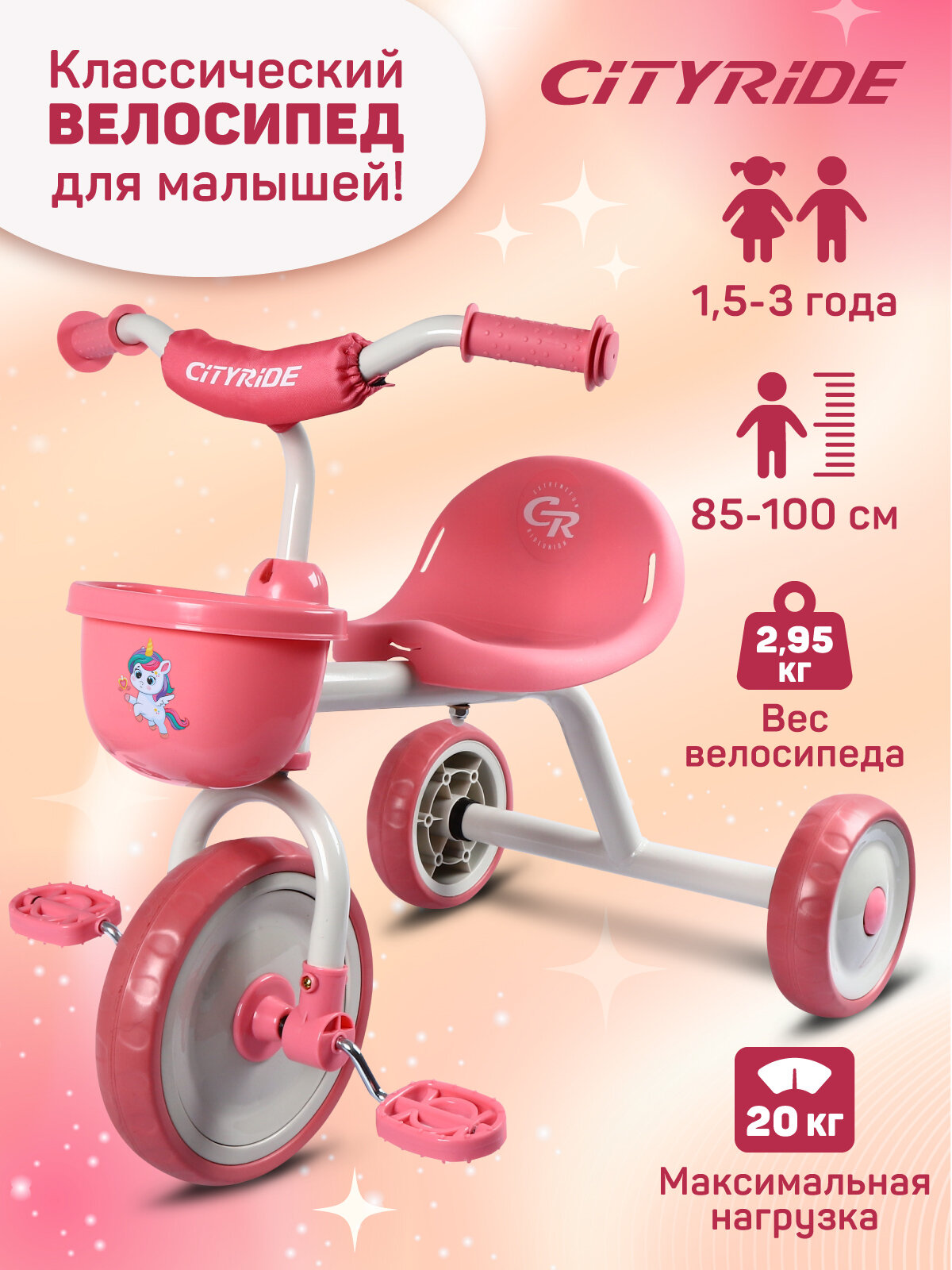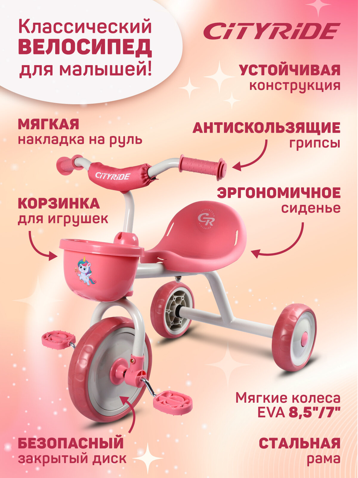 Велосипед детский трехколесный ТМ CITYRIDE, пластиковые колеса 8,5"/7", корзинка, эргономичное сиденье, CH-B3-00PK