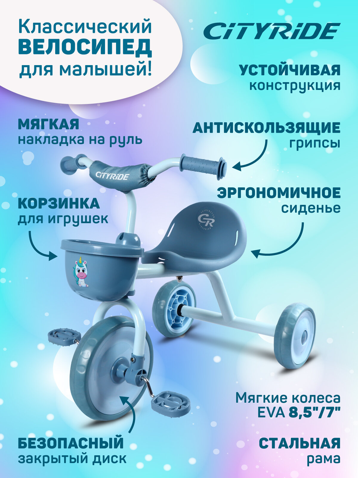 Велосипед детский трехколесный ТМ CITYRIDE, пластиковые колеса 8,5"/7", корзинка, эргономичное сиденье, CH-B3-00ED
