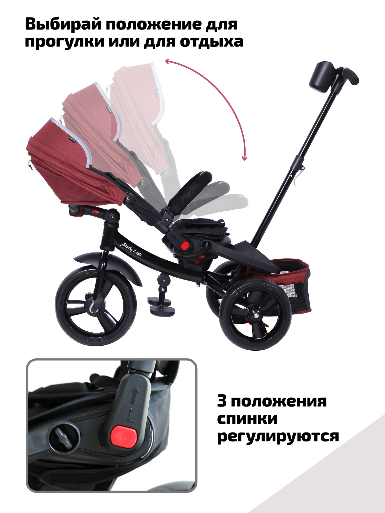 Велосипед детский трехколесный Moby Kids трансформер с ручкой управления, поворот сиденья, бордовый, от 1 голда интересное: