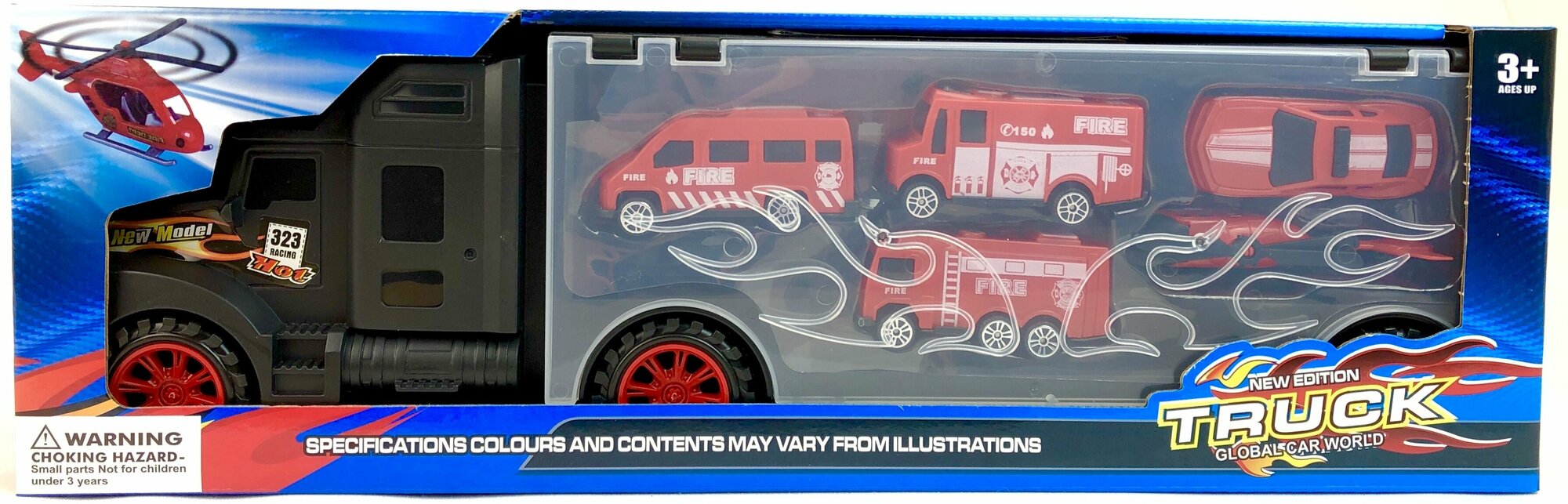 Купить Трейлер с машинками, автовоз с набором пожарных машинок и вертолетом, кейс с ручкой, 40х12х9 см