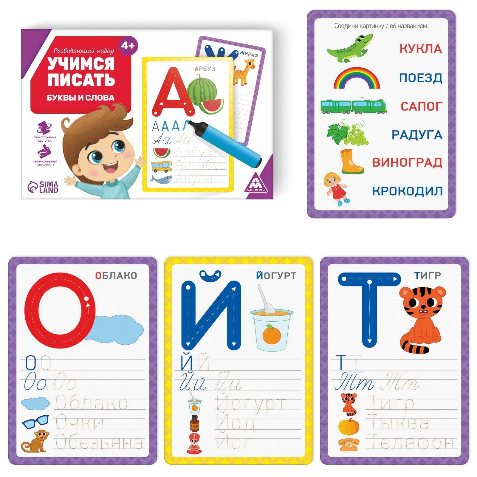 Развивающий набор "Учимся писать. Буквы и слова", пиши-стирай, 18 карт, маркер в комплекте, для детей и малышей от 4 лет