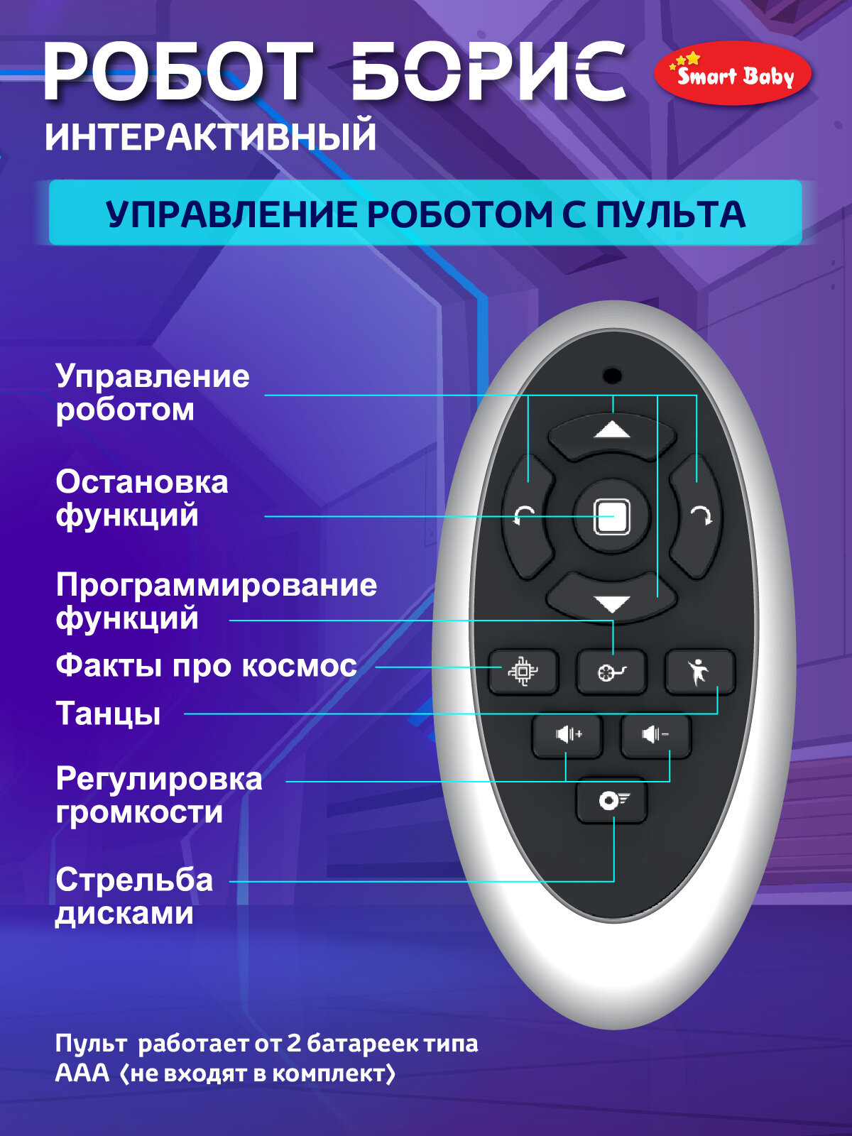 Интерактивный робот на радиоуправлении Борис ТМ Smart Baby, ходит, танцует, обучает интересным фактам о космосе, стреляет дисками, свет/звук