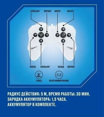 | Комплектация | Робот 1 шт., пульт управления 1 шт., аккумулятор LI-ion 600 mAh 3.7V 1 шт., USB-провод для заряда аккумулятора 1 шт., инструкция на русском языке 1 шт. |