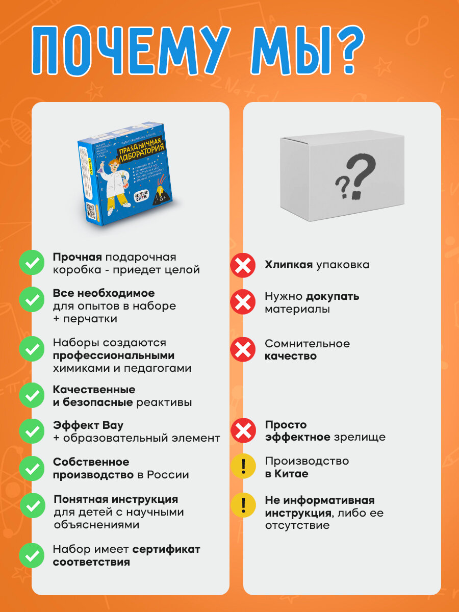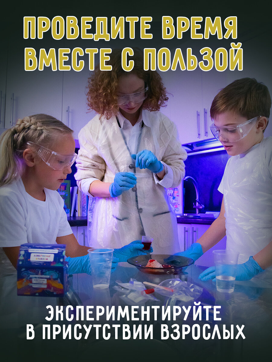 | Комплектация | Набор для опытов, инструкция, коробка, средства защиты, реактивы и лабораторная посуда |