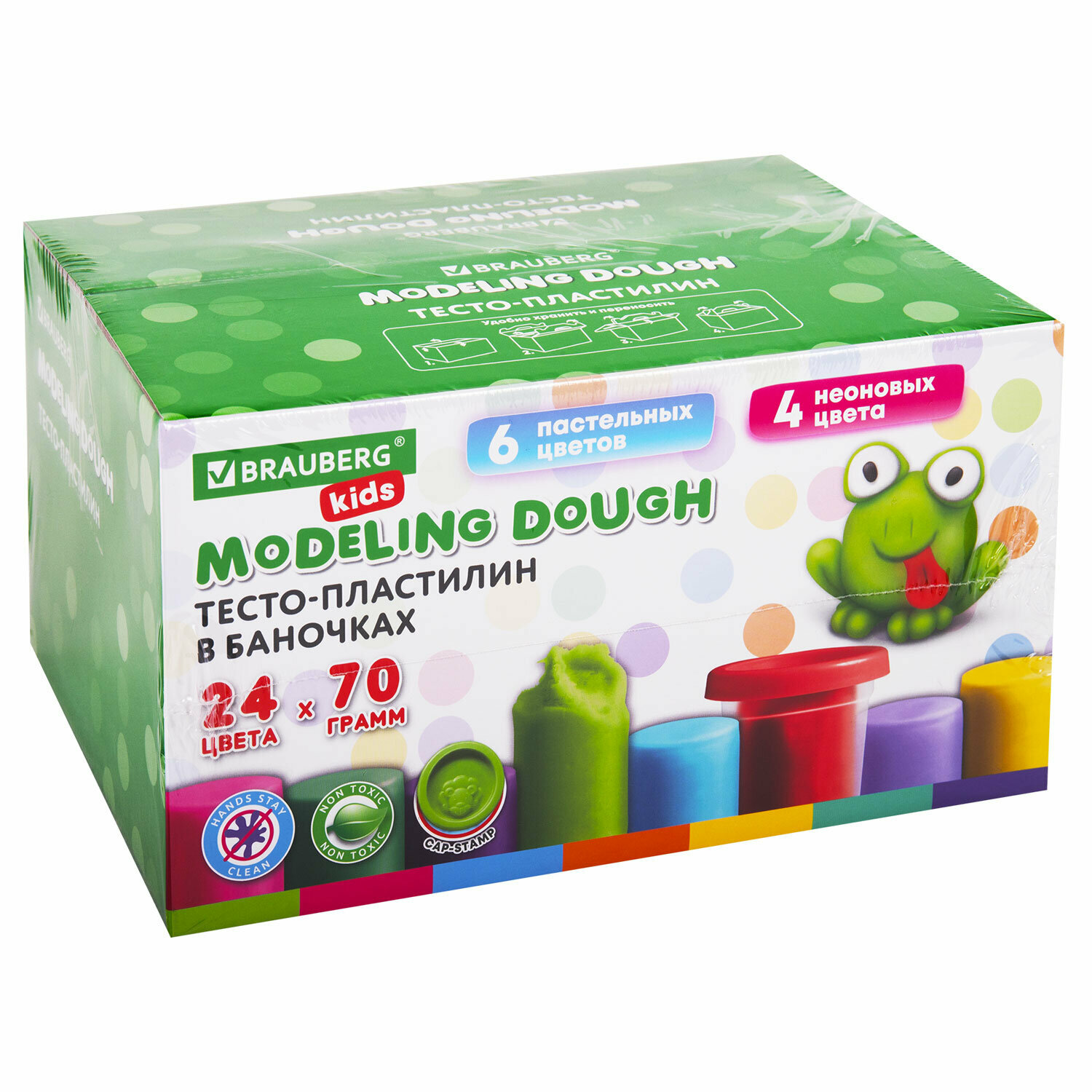 Купить Пластилин-тесто для лепки BRAUBERG KIDS, 24 цвета, 1680 г, крышки-штампики, сундучок, 106722