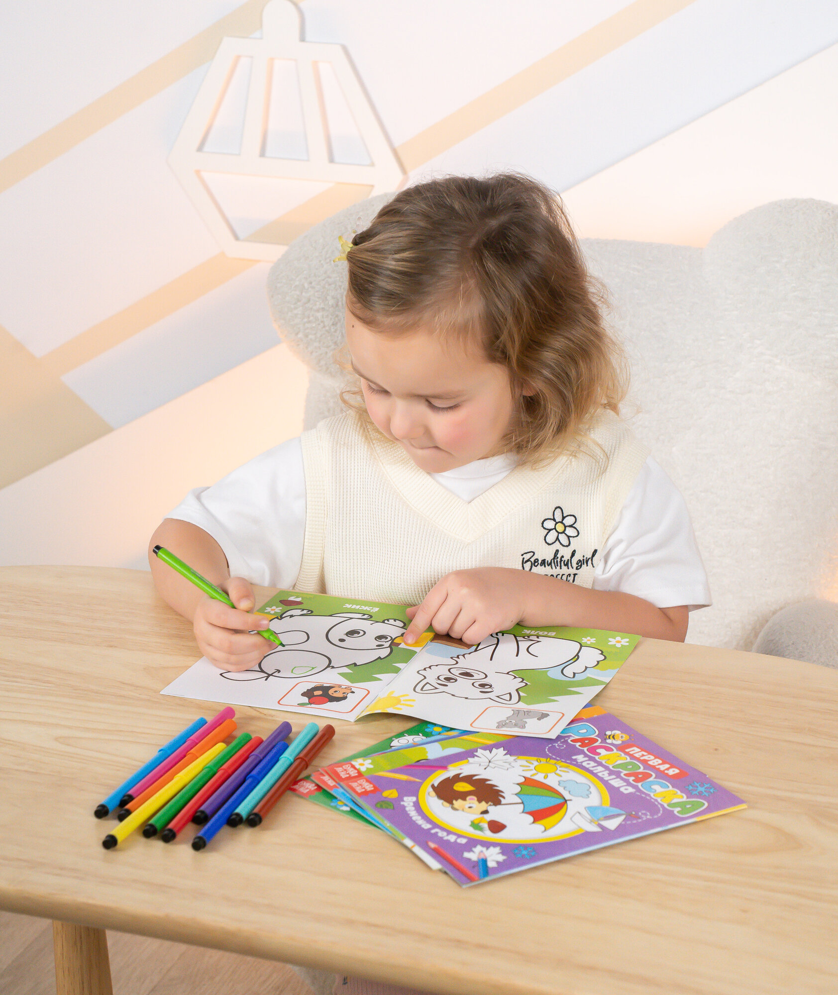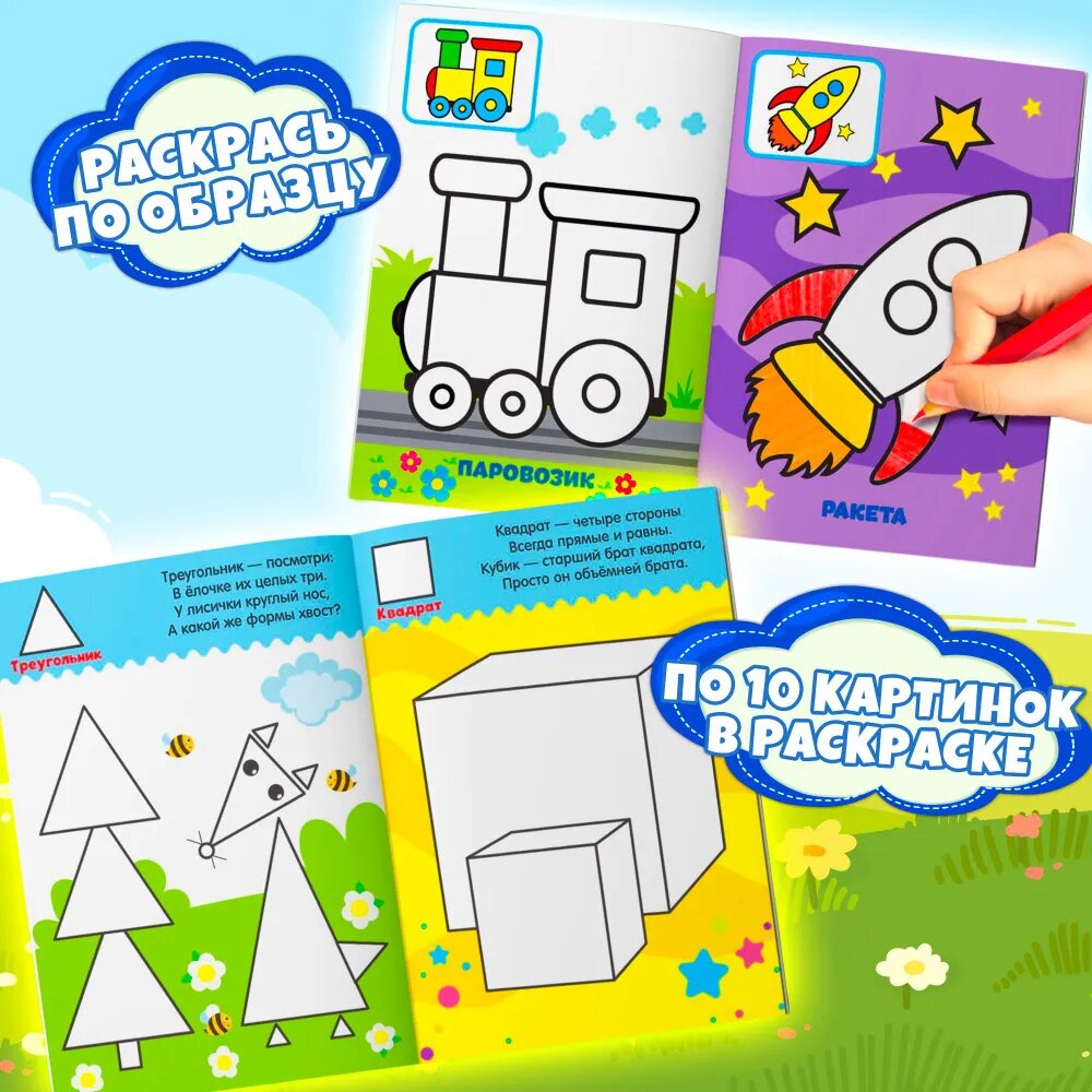 | Комплектация | раскраска «Жители леса», раскраска «Сказки», раскраска «Большой и маленький» со стихами, раскраска «Времена года» со стихами, раскраска «Изучаем формы» со стихами, раскраска «Весёлые зверята» со стихами, раскраска «Транспорт», раскраска «Моя ферма» |